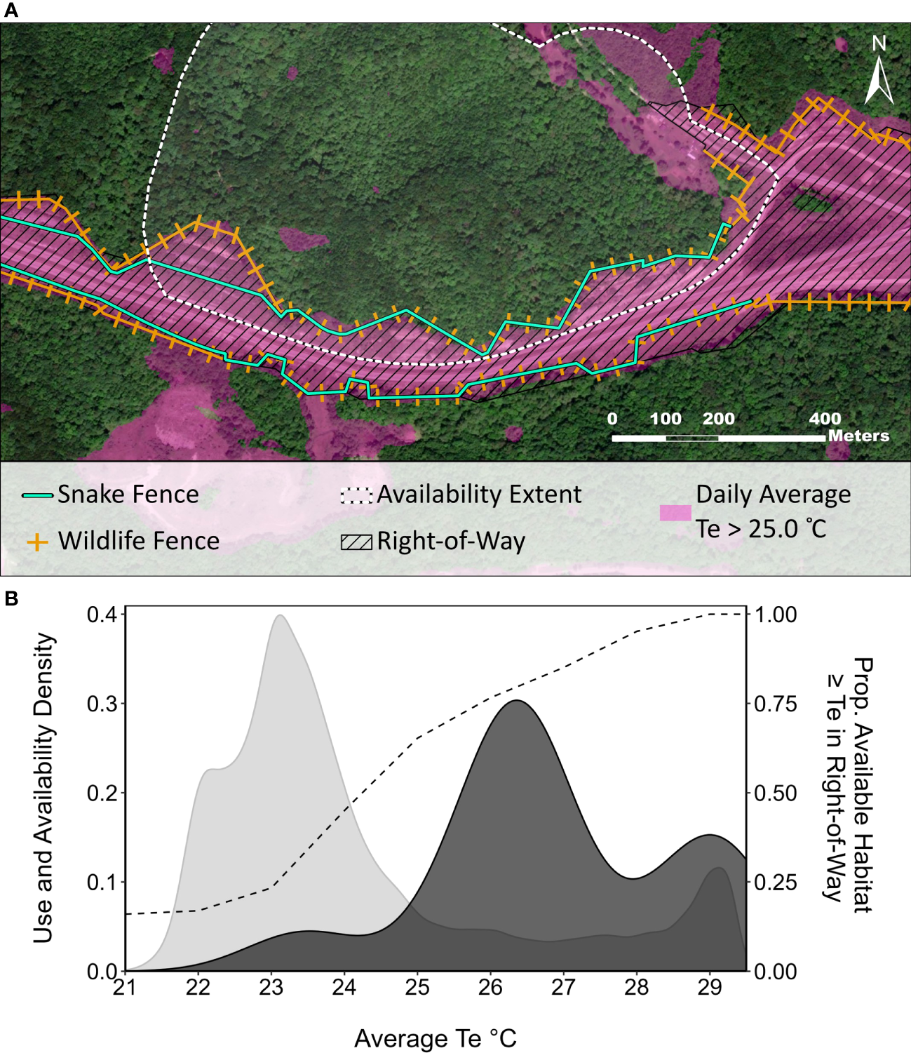 Few studies have investigated how road mitigation design and roadside habitats interact to affect animal behavior and mitigation performance in snakes (Macpherson et al., 2021). We evaluated the effects of a mitigated highway on timber rattlesnakes in southeast Ohio, where the species is listed as Endangered under State law (Ohio Revised Code 1531.25). We report how a mitigated highway affected movement and space use by rattlesnakes, and how thermal resources impacted mitigation success as a function of exclusion fence design and placement. We predicted that thermal conditions preferred by gravid females would be available for more hours of the day in the ROW and edge habitats compared with the surrounding forest, and that preferred gestation habitats would be concentrated within the ROW. We also predicted that surface habitats within the ROW would exceed voluntary thermal tolerances, and that non-gravid snakes would avoid those habitats.