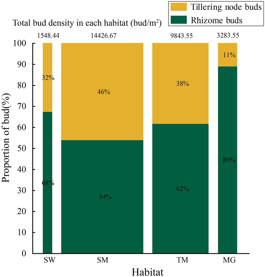 The width of the columns and the numbers at the top denote the bud density of Deyeuxia angustifolia, and different colors indicate the proportion of different types of buds.