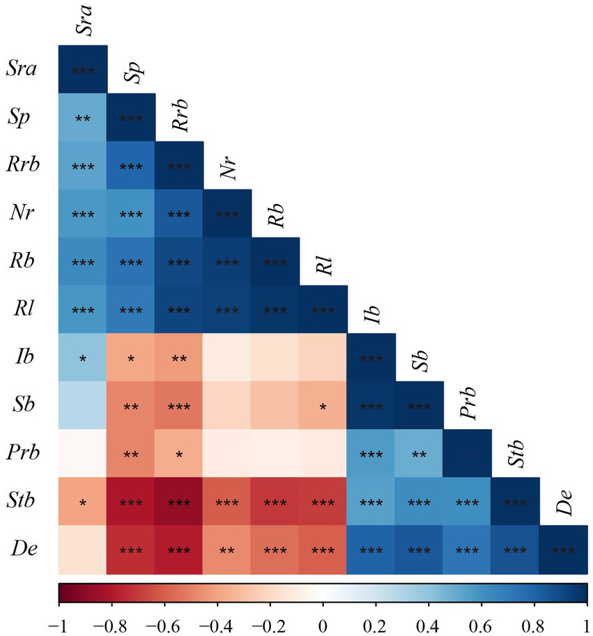 Pearson correlation among reproductive characteristics of D. angustifolia. Rl, rhizome length per plant; Nr, number of rhizome buds per plant; Sp, spacer; Rrb, proportion of rhizome bud; Rb, rhizome biomass per plant; Stb, tiller node bud per plant; Sra, sexual reproduction allocation; De, density; Prb, population rhizome biomass; Ib, inflorescence biomass; Sb, sexual plant biomass. * indicate the level of correlation, *p < 0.05; **p < 0.01; ***p < 0.001.