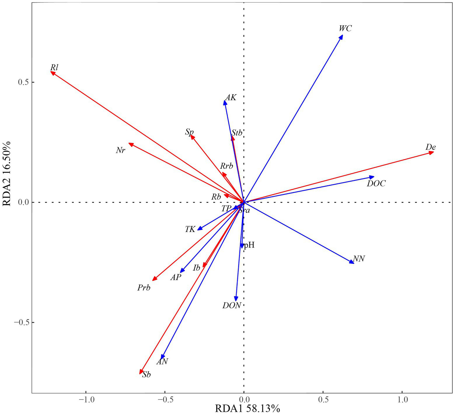Relationship between reproductive characters and soil factors in redundancy analyses. Rl, rhizome length per plant; Nr, number of rhizome buds per plant; Sp, spacer; Rrb, proportion of rhizome bud; Rb, rhizome biomass per plant; Stb, tiller node bud per plant; Sra, sexual reproduction allocation; De, density; Prb, population rhizome biomass; Ib, inflorescence biomass; Sb, sexual plant biomass. pH, Soil pH; AP, Available phosphorus; TP, Total phosphorus; TK, Total kalium; AK, Available kalium; DOC, Dissolved organic carbon; DON, Dissolved organic nitrogen; NN, Nitrate nitrogen; AN, Ammonia nitrogen; WC, Soil water content.