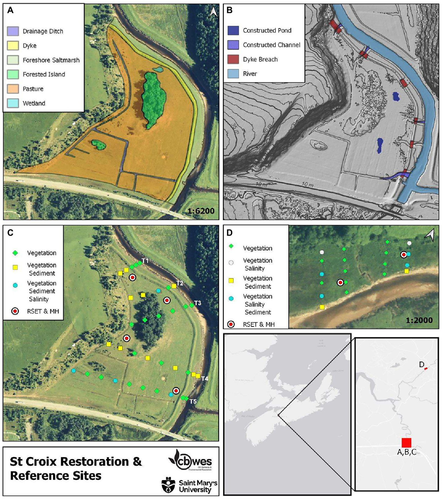 St. Croix site (A) Pre-restoration habitat map; (B) Restoration plan; (C) Sampling locations; (D) Reference site.