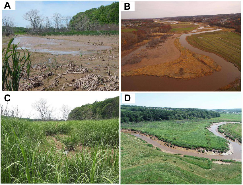 Belcher St. site (A) 2018 (Year 1 post); (B) 2018 (Year 1 post) aerial view after dyke realignment; (C) 2021 (Year 4 post); (D) 2021 (Year 4) aerial view.