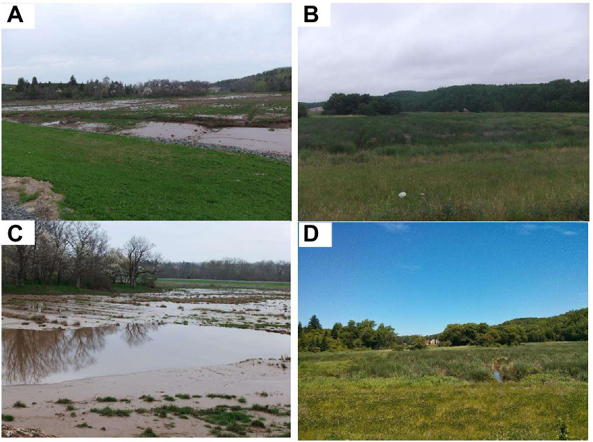 St. Croix restoration site (A) marsh landscape Year 1 (2010); (B) marsh landscape Year 3 (2012) post; (C) constructed pond Year 1 post (2010); (D) constructed pond Year 5 (2014) post facing north.