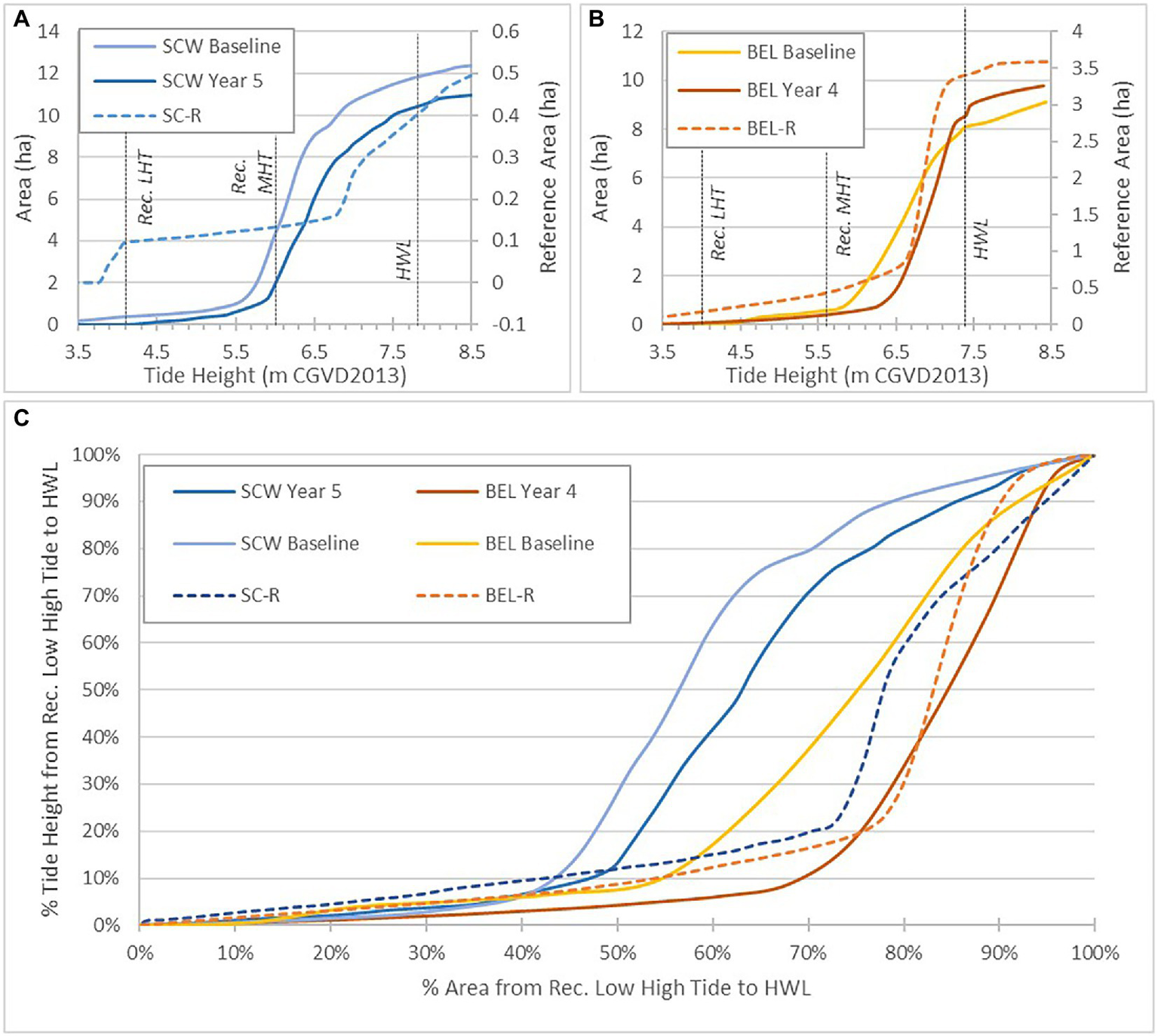 (A) SC hypsometric curves at reference site, pre, post restoration. (B) BEL hypsometric curves at reference site, pre, post restoration. (C) Area flooded (%) between recorded low high tide and HWL for SC and BEL.