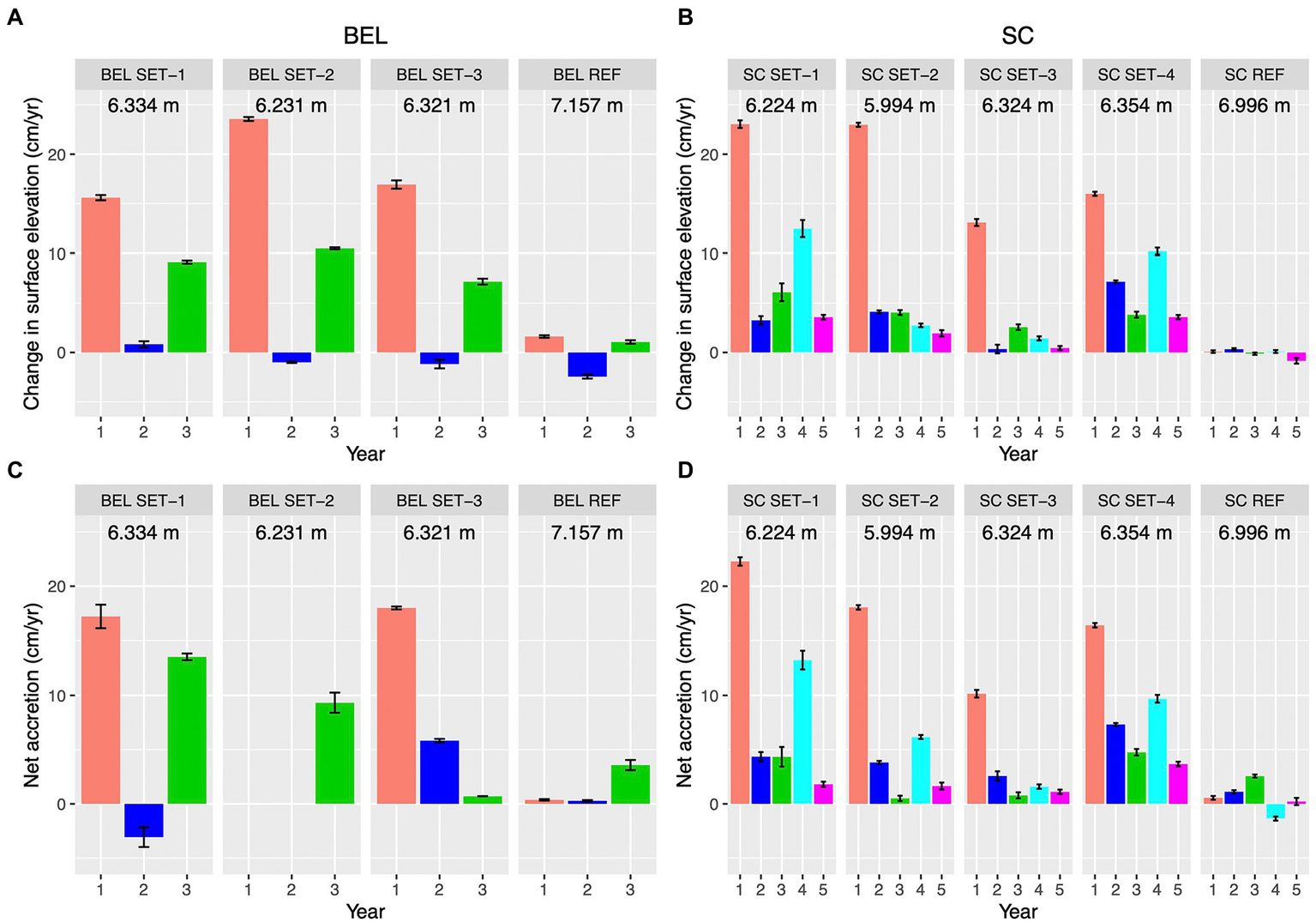 Surface elevation and sediment changes at BEL and SC restoration sites; error bars are standard errors; (A,B) Changes in surface elevation from RSET stations (Years post hydrological restoration); REF indicates reference site stations. Means are calculated across all pins on each station; (C,D) Accretion measured at RSET stations using marker horizons. Means calculated from three marker horizons per RSET location, REF indicates reference site stations.