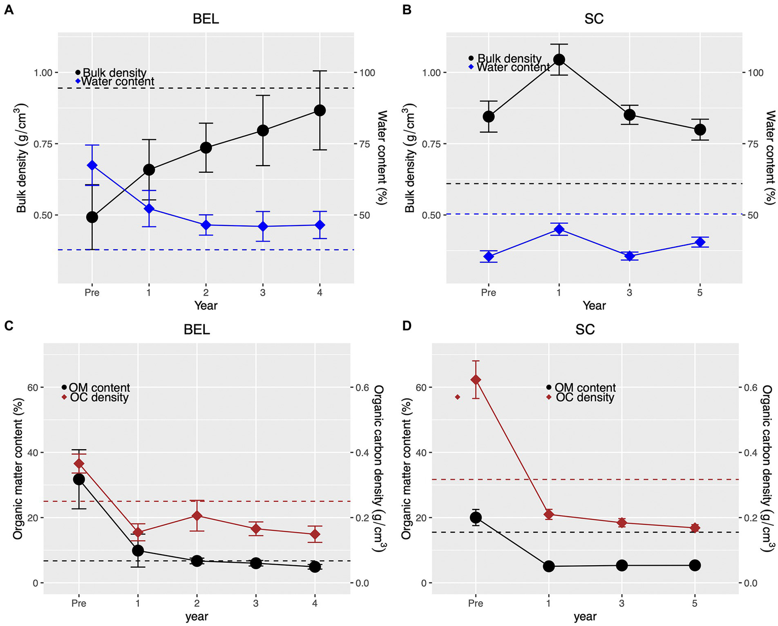 (A,B) Sediment core bulk density and water content at BEL and SC restoration sites. Dotted horizontal lines represent the average value for cores taken at the respective reference sites. (C,D) Sediment core organic matter content and organic carbon density changes at BEL and SC restoration sites. Dotted horizontal lines represent the average value for cores taken at the respective reference sites; error bars are standard errors.