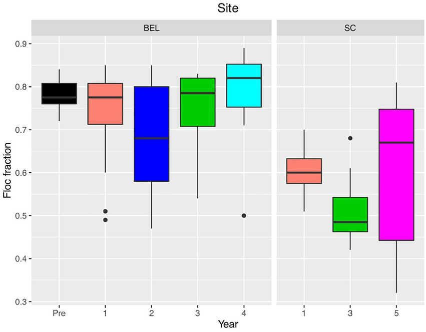 Floc fraction for sediment samples over time at BEL and SC restoration sites.