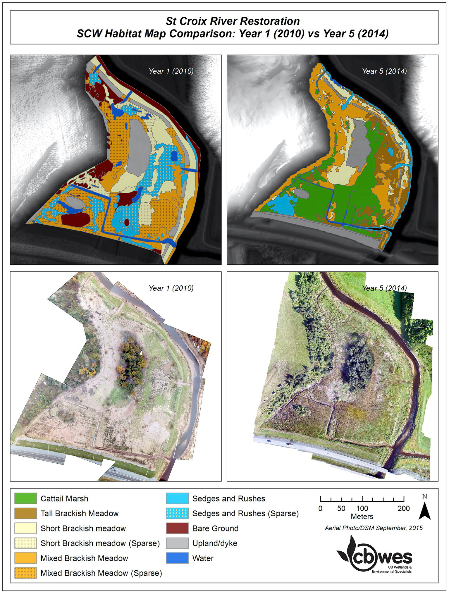 After re-establishing tidal flow, sediment accretion was very rapid, leading to a deep layer of new sediments. Plant colonization at both sites resulted in a high diversity of halophytes in the first 2 years post restoration, but the St. Croix site transitioned to freshwater wetland species dominating by the fifth year post- restoration. The Belcher St. site has a mix of freshwater and brackish wetland species after the fourth-year post-restoration.