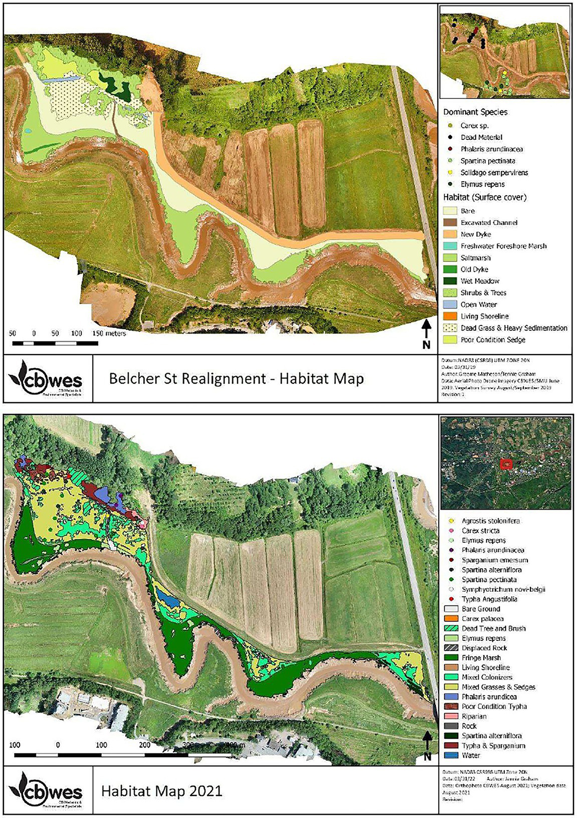 We implemented tidal wetland restoration projects on two tidal rivers near the inland limit of saltwater. Hydrological restoration involved breaching (St. Croix) or realigning agricultural dykes (Belcher Street). We monitored hydrology, sediment accretion and vegetation at replicated plots on restoration sites and nearby reference tidal marshes; and conducted habitat mapping and elevation surveys using drones.