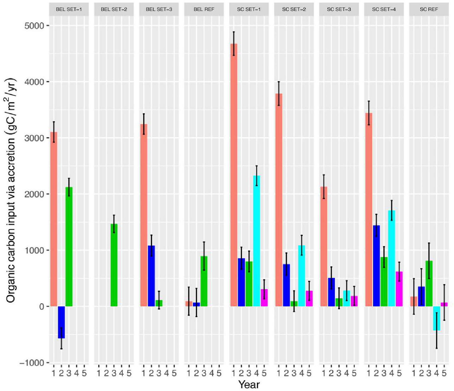 Accretion was net positive for all stations that could be measured in the first year, and much greater than at each respective reference site (Figure 6). At BEL SET-02 in Year 2, the depth of accreted sediments exceeded the depth of the sampling containers, so this station was not sampled in that year. In Year 2, the two stations that could be measured had a negative value at SET-1, but a positive value at SET-3. Net accretion at BEL over the 3 years ranged from 9.3 cm to 27.6 cm while the BEL reference site showed only 4.2 cm of accreted sediments; at SC, patterns were similar with 13.7 cm to 33.0 cm compared with 7.3 cm at the reference site. Overall, high accretion and elevation gains in the first year were followed by lower gains in subsequent years.