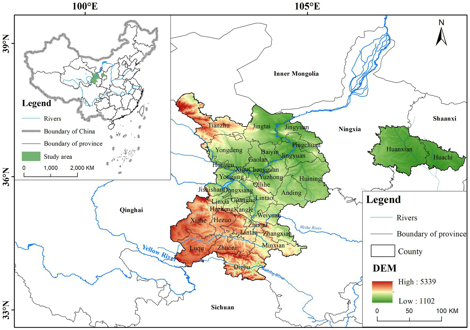 The AEGC (33°40′ ~ 37°54′N, 101°55′ ~ 108°34′E) includes 35 districts and counties (Figure 1), covering an area of 99,300 km2. It is located on the eastern edge of the Tibetan Plateau and is a transition zone for major geographical units. It is known as the “Asian water tower” and is connected to the Tibetan Plateau in the west, Qinba Mountain in the south, the Loess Plateau in the east, and the Hexi Corridor in the north (Zhang et al., 2016; Immerzeel et al., 2020). The study area spans the two major river basins of the Yellow River and the Yangtze River and is an important source of water for the Yellow River. Its main rivers are the Tao River, Wei River, Huangshui River, and Bailong River (Qiu et al., 2022). The ecological environment in the study area is complex and diverse, and its primary landforms are plateaus, mountains, hills, and river valleys (Nie et al., 2015). Its altitude is 1,102 ~ 5,339 m, and is generally higher in the west and lower in the east. Precipitation is higher in the south (about 800 mm per year) and lower in the north (about 200 mm per year), with an average annual temperature of 1 ~ 11°C. In the summer, temperatures are higher, and there is more precipitation, while in the winter, temperatures are lower with less precipitation. As a result, there are differences in topography, climate, hydrology, and land use among the regions of the AEGC (Ma et al., 2020).