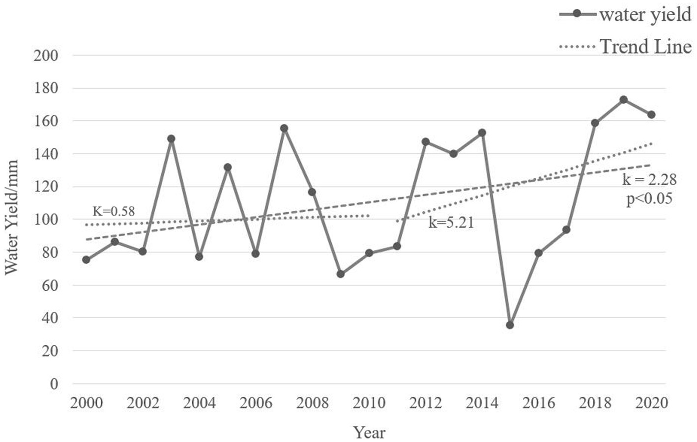 Inter-annual changes of WYs in AEGC from 2000 to 2020. The black solid line is the WYs, and the dotted line is the change trend of WYs.