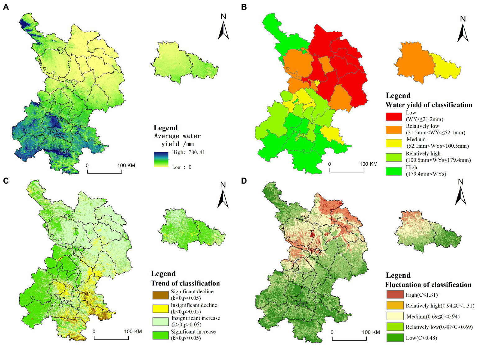 Spatial distribution characteristics and change rules of WYs. It shows the spatial distribution of the average WYs from 2000 to 2020 (A), and the statistics of WYs based on the county-level administrative units (B). Due to the large interannual variation of WYs, in order to intuitively display the spatial regularity of WYs over a long period of time, we have carried out trend analysis (C) and coefficient of variation calculation (D).