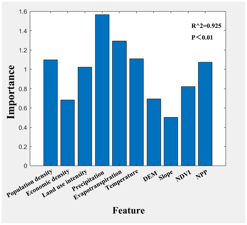 The driving factors of WYs have always been the focus of relevant research. In this study, based on the establishment of a comprehensive database including human activity factors and natural condition factors, the RF was applied to evaluate the relative importance of these factors. According to the results (Figure 5), Ranking of importance of independent variables: precipitation (1.57) > evapotranspiration (1.29) > temperature (1.12) > population density (1.10) > NPP (1.06) > land use intensity (1.02) > NDVI (0.83) > DEM (0.71) > economic density (0.68) > slope (0.51). Indicators with relative importance greater than 1 were selected for GTWR analysis.