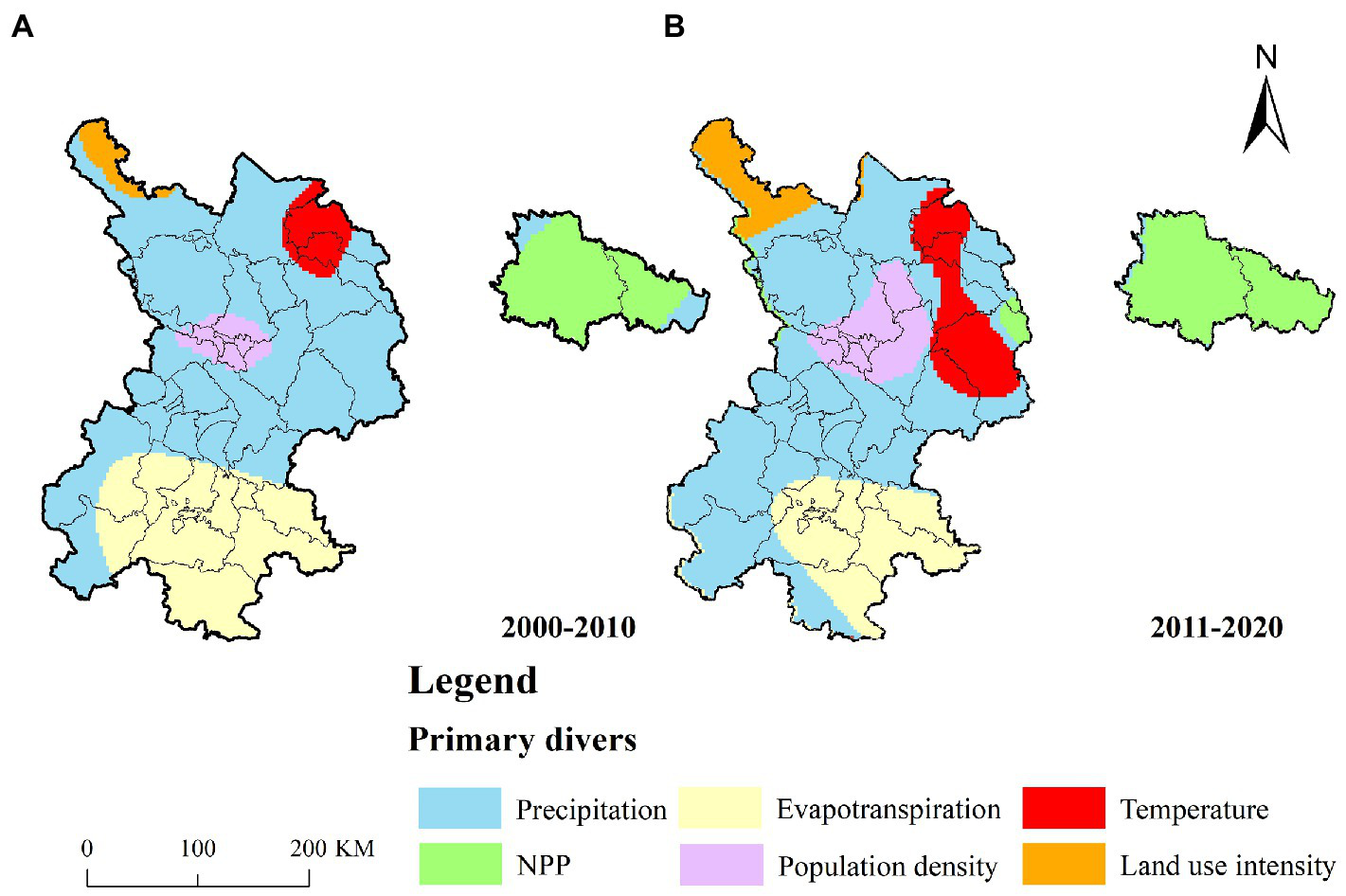 Spatially identify the first influencing factor of WYs in each region. Taking 10 years as a stage, the rule changes of each type of influencing factors on WYs were discussed. (A, B) are the spatial distribution of the dominant active factors for WYs in 2000–20010 and 2011–2020, respectively.