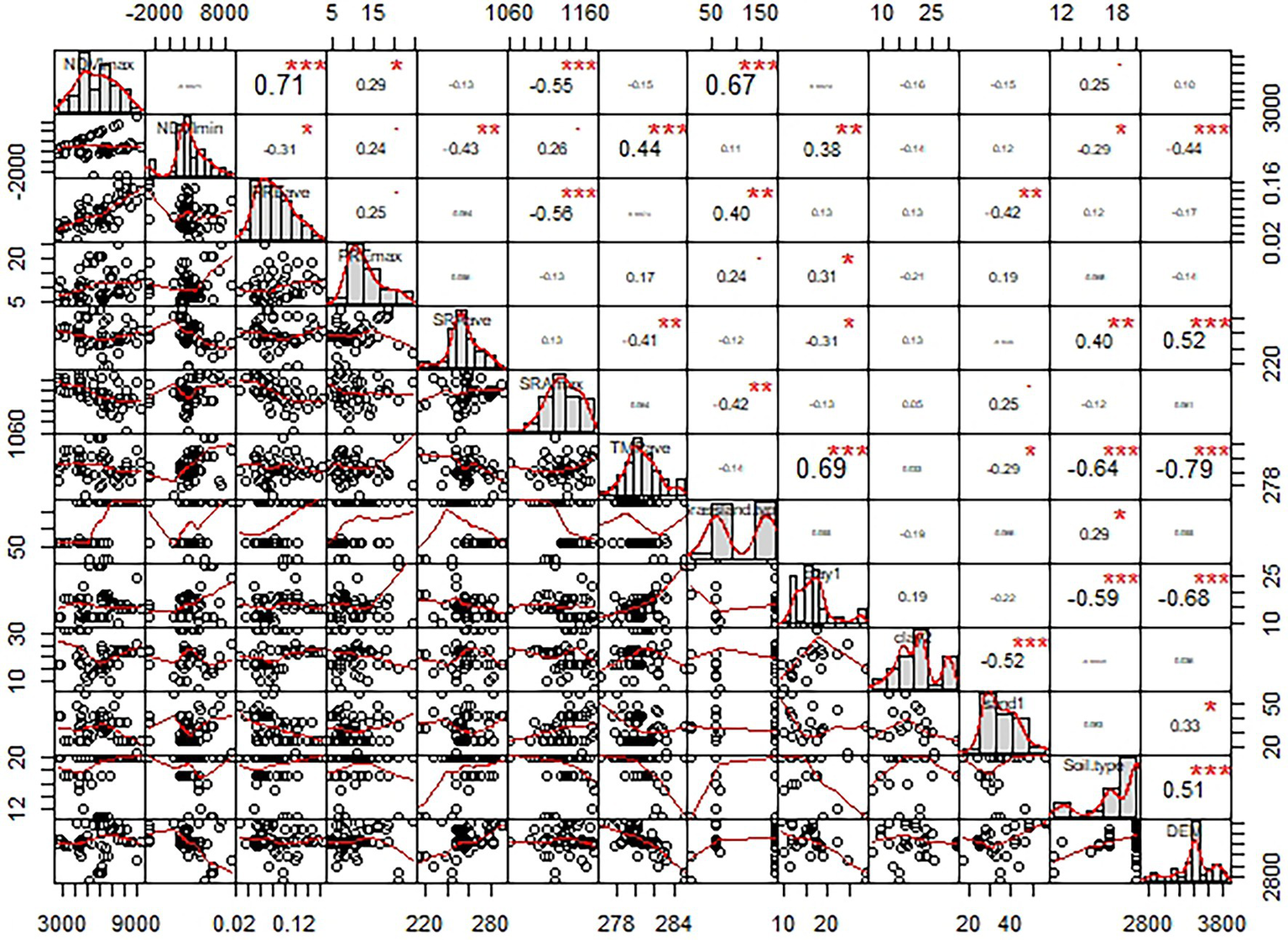 The correlation of Pearson coefficient among factors. NDVImax, NDVImin, PREave, PREmax, SARave, SRAmax, TMPave, Clay1, Clay2, Sand1, and DEM refers to the maximum normalized difference vegetation index, the minimum normalized difference vegetation index, the average precipitation, the maximum precipitation, the average solar radiation, the maximum solar radiation, the average temperature, the clay concentration of surface soil, the clay concentration of bottom soil, the sand concentration of surface soil, and digital elevation model, respectively. *denotes p < 0.05, **denotes p < 0.01; ***denotes p < 0.001.
