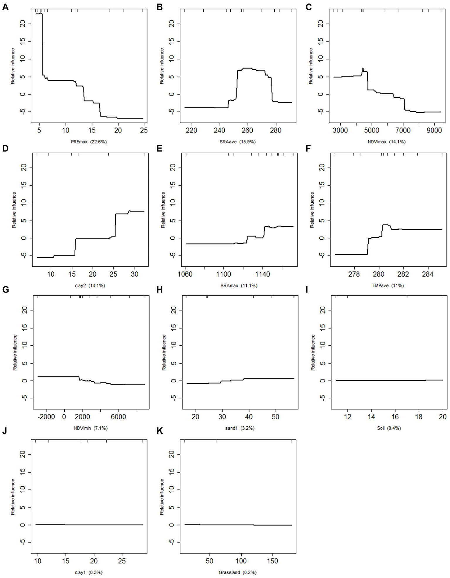 The relative contribution of the environment variables. (A-K) refers to the maximum precipitation (PREmax), average solar radiation (SRAave), maximum NDVI (NDVImax), clay concentration of bottom soil (Clay2), maximum solar radiation (SRAmax), average temperature (TEMave), minimum NDVI (NDVImin), sand con-centration of surface soil (Sand1), soil type (Soil), clay concentration of bottom soil (Clay1), and grassland type (Grassland), respectively. X is the value of each environmental variables.