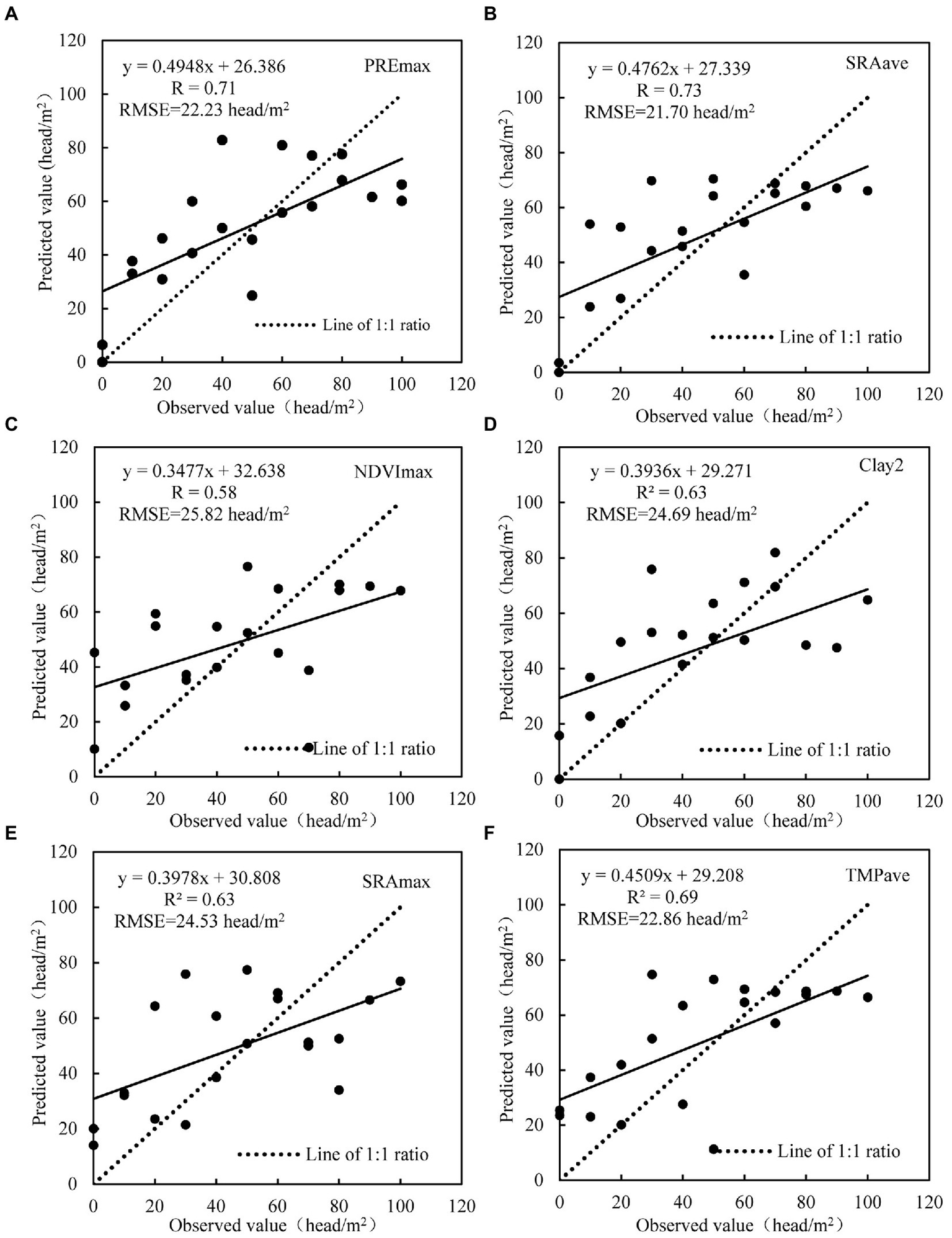 The relationship between the observation value and predicted value. (A-F) refers to the maximum precipitation (PREmax), average solar radiation (SRAave), maximum NDVI (NDVImax), clay concentration of bottom soil (Clay2), maximum solar radiation (SRAmax), and average temperature (TEMave), respectively.