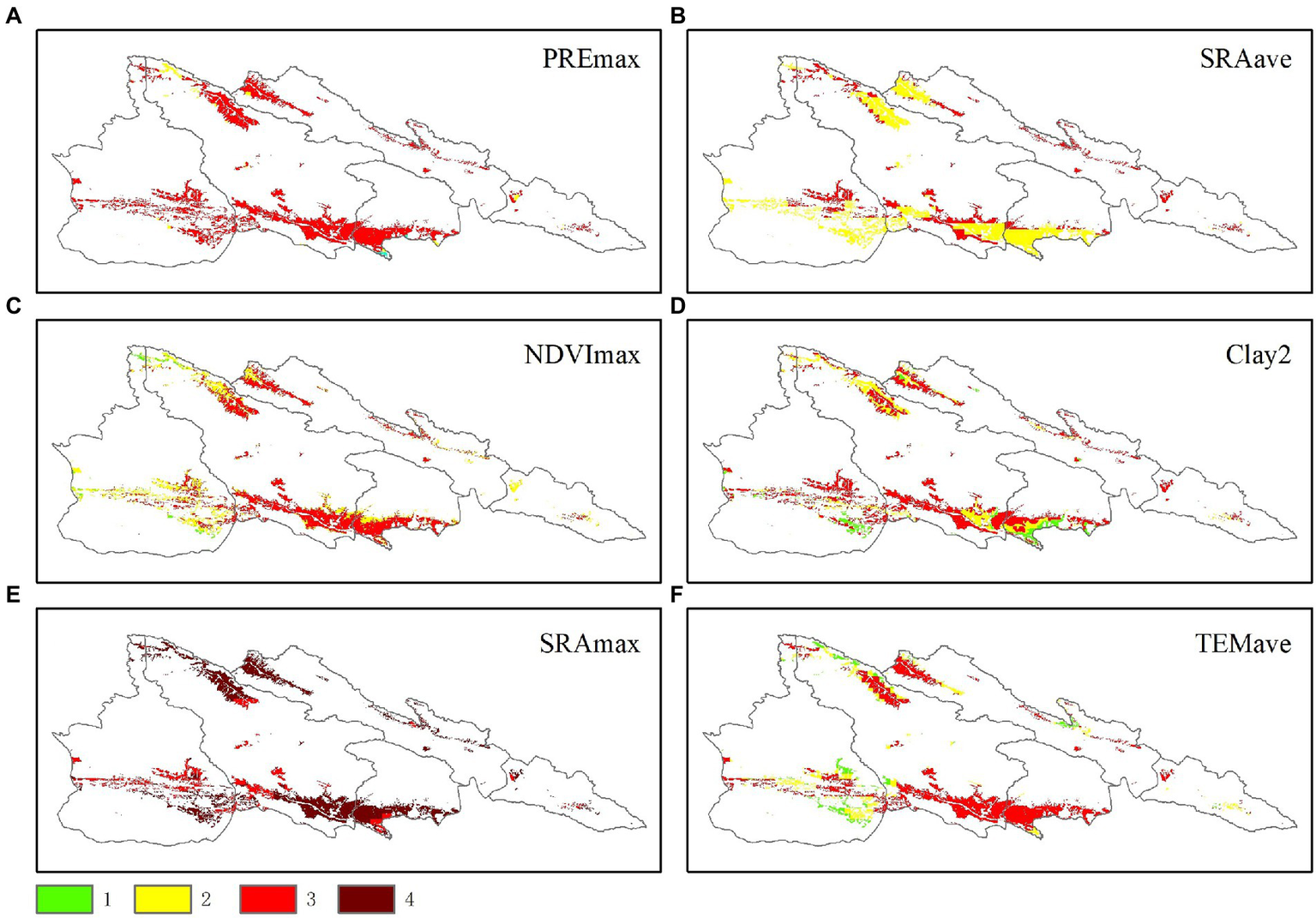 The PREmax, SRAave, NDVImax, Clay2, SRAmax, and TMPave refers to the maximum precipitation, the average solar radiation, maximum normalized difference vegetation index, clay content in depth soil, maximum solar radiation, average temperature, respectively.