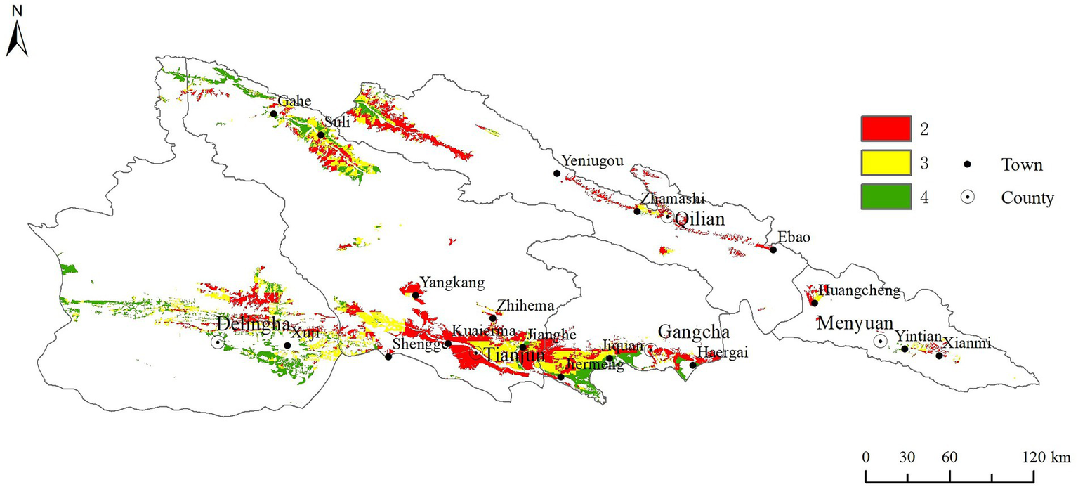 The inhabitable area distribution was shown in Figure 6. The inhabitable areas two were mostly distributed in the south of Tianjun County, middle and northwest of Qilian County, accounting for 27% of the study area. The inhabitable areas four were mostly found to south of Gangcha County, northwest of Tianjun County, and most of Delingha City, account for 20% of the study area. The inhabitable areas three were scattered between inhabitable areas two and inhabitable areas four, with the area of 53% of the study area.