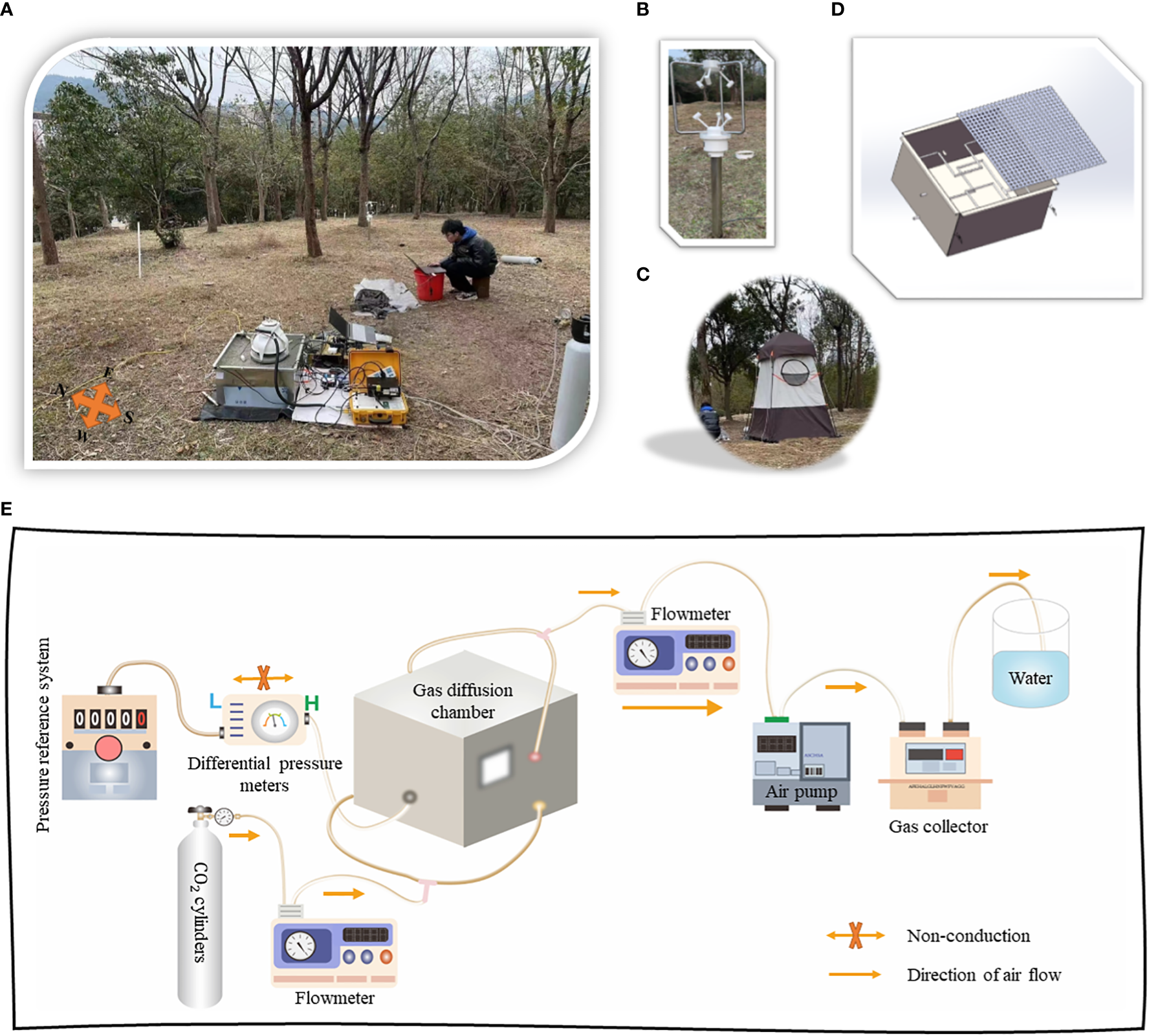 Experimental equipment and scene layout for this study. (A) Site layout plan of the experimental equipment. (B) The location of the anemometer installation. (C) Near-surface wind isolation equipment (tents). (D) Three-dimensional model drawing of the diffusion gas chamber. (E) Schematic diagram of the gas control system.