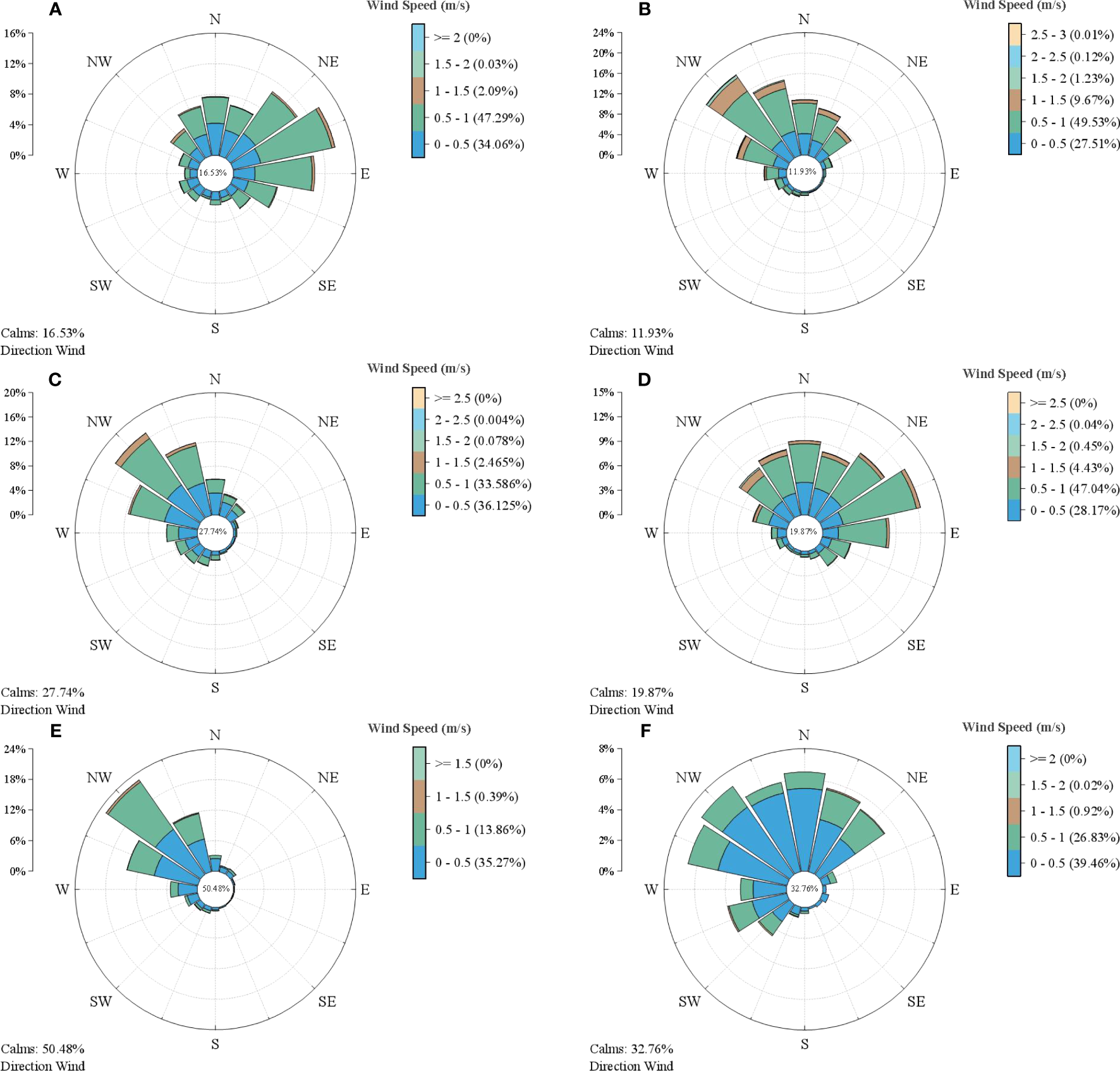 Wind rose diagram at 1 m from the surface at the field experiment site (January 2022). (A–D) Near-surface wind-related data during the day (9:00–17:00). (E, F) Near-surface wind-related data at night (19:00–23:00). The central band represents the calm (no wind) state; the colored bars represent the different wind speeds and the data represent the proportion of the corresponding wind speed; the circular concentric circles and the coordinating scale represent the proportion of wind speeds in different directions.