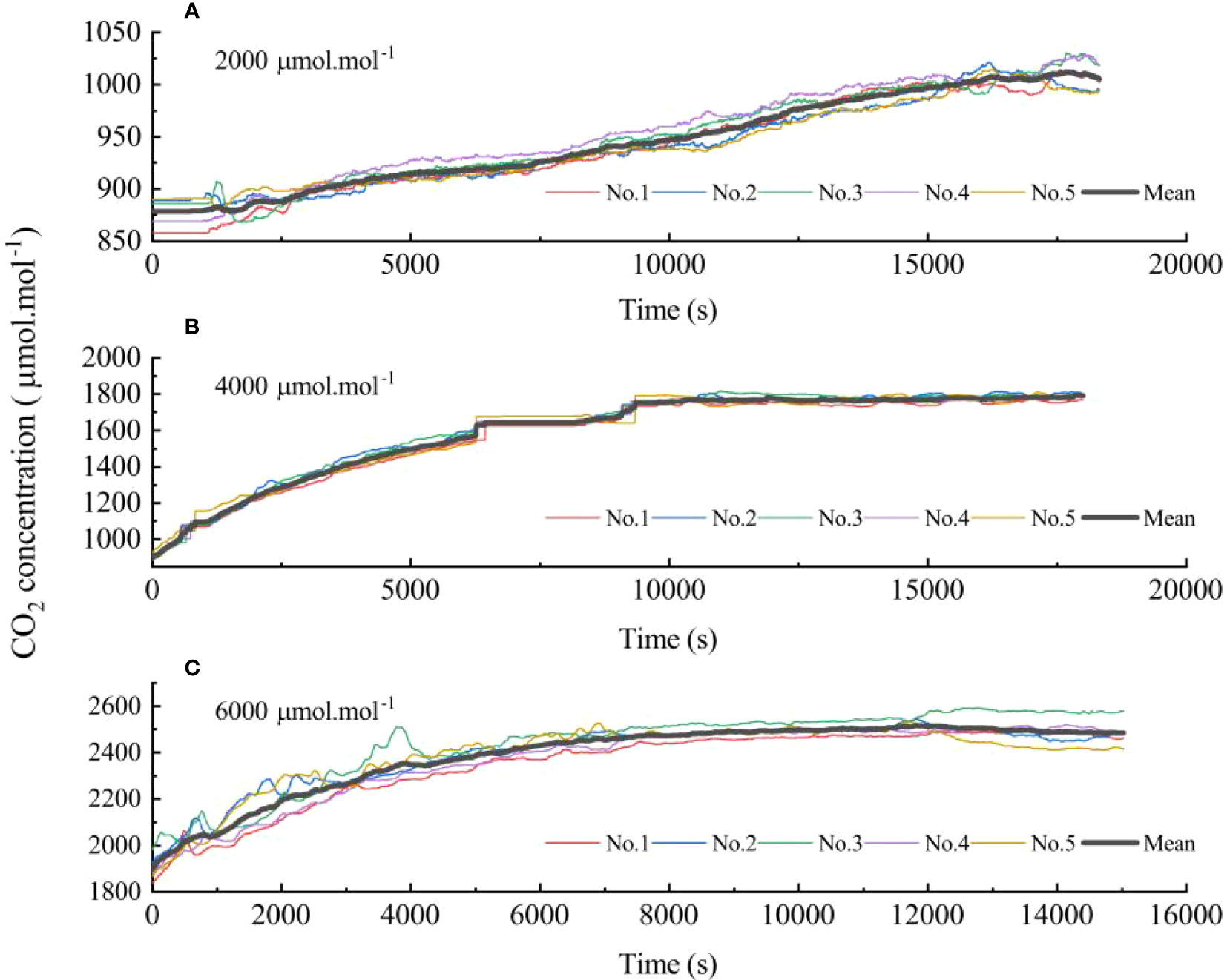 Curve of CO2 concentration in diffusion chamber with time during the experimental process (inlet and outlet gas flow: 0.6 L·min−1). (A–C) CO2 tracer gas concentrations of 2,000, 4,000, and 6,000 μmol·mol−1, respectively. The five different colors represent the readings of five CO2 sensors in the diffusion chamber, and the thick black line represents the average CO2 concentration in the diffusion chamber.