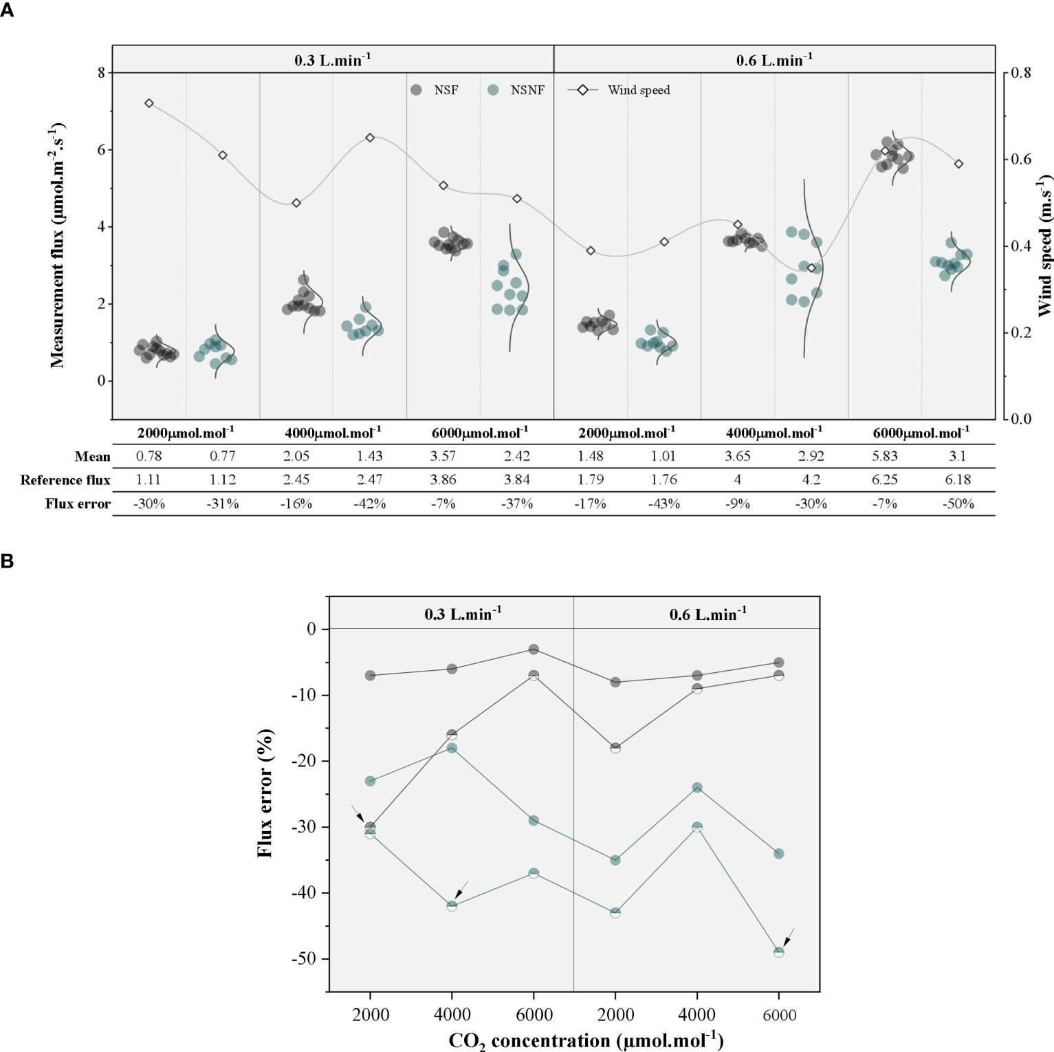 Plot of flux statistics monitored in the closed air chamber exposed to wind, with comparison of flux errors. (A) The flux statistics measured in the closed chamber at different CO2 gas concentrations and flow rates. The horizontal coordinates represent the reference flux of the diffusion chamber. The flux error is the average measured flux of the closed chamber relative to the reference flux. The white dots of the diamond represent the average wind speed during the monitoring of the closed chamber. (B) The error in CO2 flux measurements for closed gas chambers for different experimental variables (gas flow, concentration, and wind speed), where black represents NSF chambers, dark green represents NSNF chambers, solid circles represent chambers not exposed to wind, half-circles represent chambers exposed to wind, and arrows represent significant effects of wind on closed chamber flux measurements. Negative values have the same meaning as before.