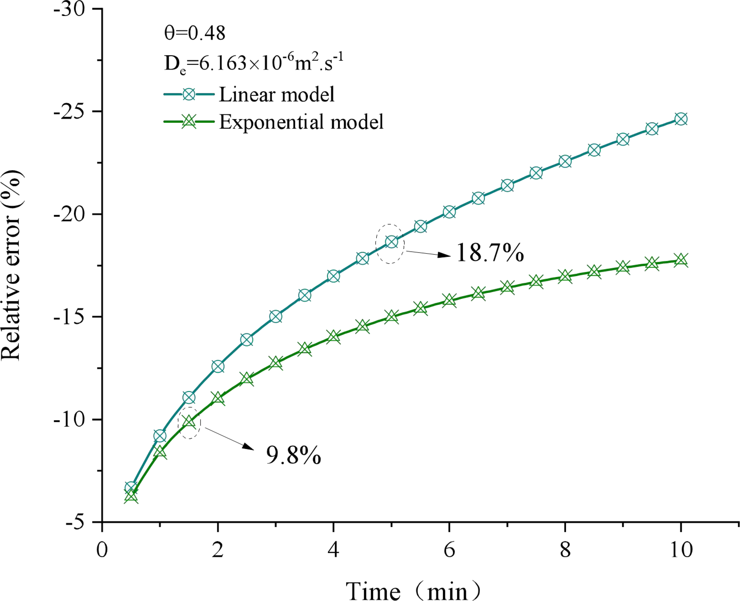 In this study, we investigated the bias in flux calculations in a wind-influenced environment. According to previous studies, near-surface winds enhance soil gas transport; thus, the effective gas diffusion coefficient De (or “apparent diffusion coefficient”) is greater in a windy environment than that in a windless environment. To quantify the enhancement of soil gas transport by near-surface winds, the wind-induced diffusion coefficient Dw was determined by recording the CO2 concentration change rate in the gas chamber after stopping the aeration of the diffusion chamber and allowing the gas to diffuse freely within the chamber. Based on the data in Figure 9, the diffusion chamber flux is 16% greater after being exposed to winds, meaning that near-surface winds enhance soil gas transport and increase gas “apparent diffusion coefficient”. At this point, an error analysis based on the NDFE showed that the error in the flux calculation was positively correlated with both Dw and the monitoring duration (Figure 10). The exponential model yields better estimation results for the same monitoring duration. When gas transport was enhanced by 20% (Dw = 0.2 Ds), the relative error was −15.7% and −20.1% for the exponential and linear models, respectively, for the same monitoring period of 5 min, which significantly underestimated the flux calculation.