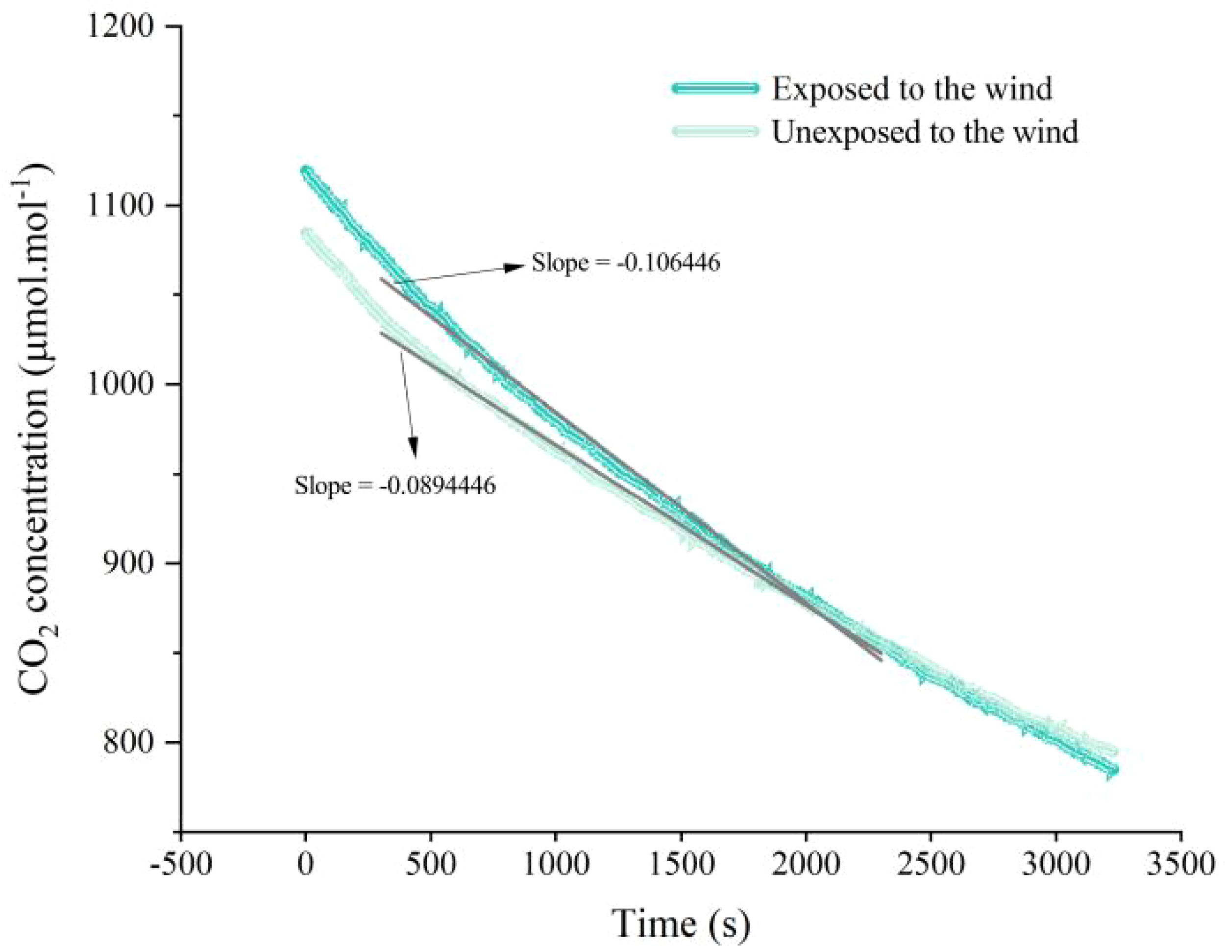 CO2 molar fraction in the diffusion chamber (exposed and unexposed to wind) as a function of time after the control system stops ventilating. The black line represents the slope of the CO2 molar fraction.