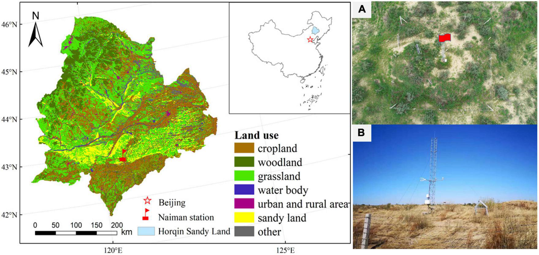 The original landscape of China’s Horqin Sandy Land was a sparse shrubland and grassland with hydrothermal conditions that were adequate to support shrubs, an abundant plant community with a diverse composition, a stable ecosystem structure, and high productivity. However, the disturbance caused by extensive human activities and the cultivation of a large area of land have caused nearly 80% of the region to experience aeolian desertification since the 1980s; after years of effort to combat this desertification, including grazing exclusion using fences, the area of desertification accounted for only 26% of the total area by the end of 2015 (Liu et al., 1996; Zhao et al., 2007; Duan et al., 2019; Li et al., 2019; Niu et al., 2020). The region’s ecological environment is extremely fragile and vulnerable to damage (Meng et al., 2008; Zhu et al., 2020). Grassland, cropland, and ecosystems with semi-fixed sands are the main land uses in this study area (Duan et al., 2019; Zhu et al., 2020). Here, we define “semi-fixed sand” as land in a semiarid area that is covered by a sandy soil and that has a vegetation cover that ranges from 30 to 50% (Zhao et al., 2008); thus, although the vegetation cover indicates some stability against future degradation, it means that recovery is still proceeding. Previous research in this area has shown that the recovering sandy grassland ecosystem was a carbon source on an annual scale, whereas a nearby sandy maize cropland ecosystem was a carbon sink, and that the amount of carbon sink in both ecosystems increased with increasing precipitation (Niu et al., 2020, 2021). To the best of our knowledge, the carbon fluxes of the recovering semi-fixed sandy land ecosystem have received little attention (e.g., Hu et al., 2015), so more studies are needed to understand the carbon flux characteristics at the ecosystem scale, especially for semi-fixed sandy land that has been protected by grazing exclusion using fences to allow natural recovery.