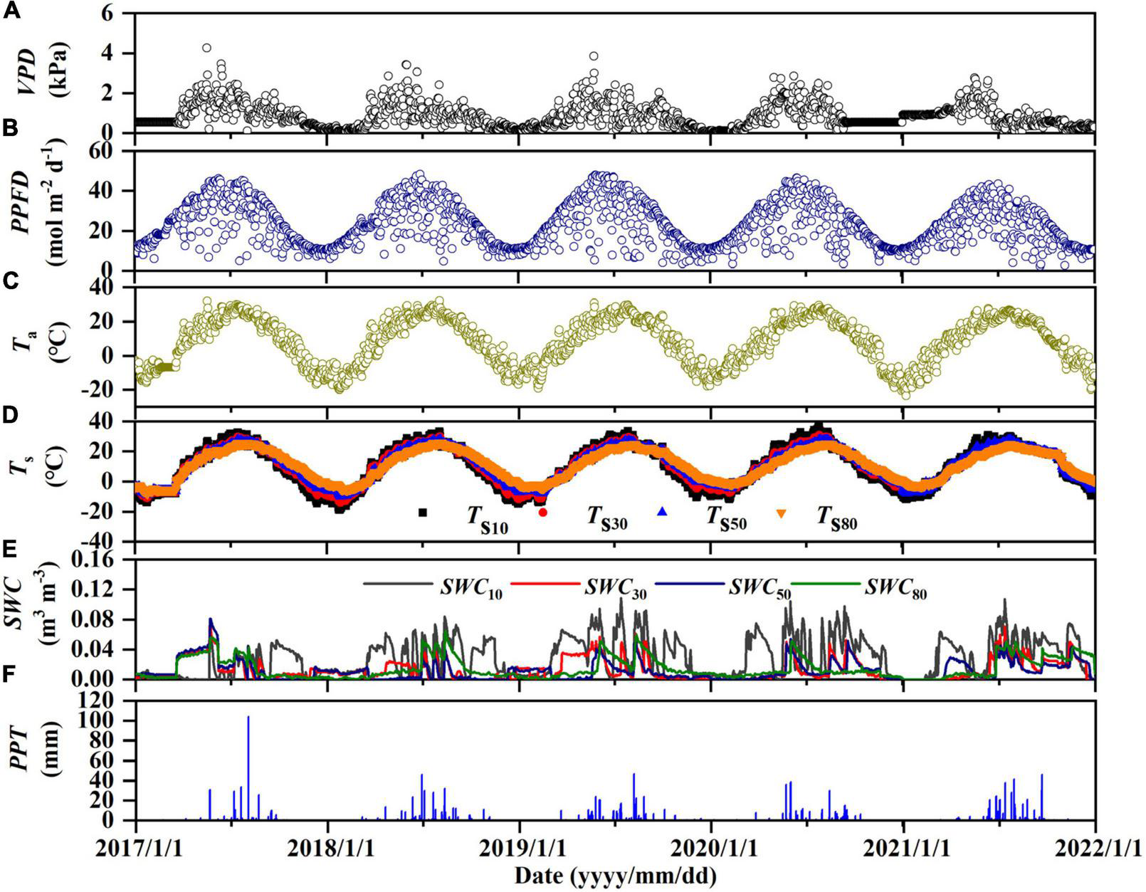 The environmental factors showed strong seasonal dynamics from 2017 to 2021 (Figure 2). Temperature (Ta and Ts) and PPFD both exhibited approximately unimodal trends. These parameters were therefore largely stable and did not differ greatly among years (Table 2 and Supplementary Table 1).