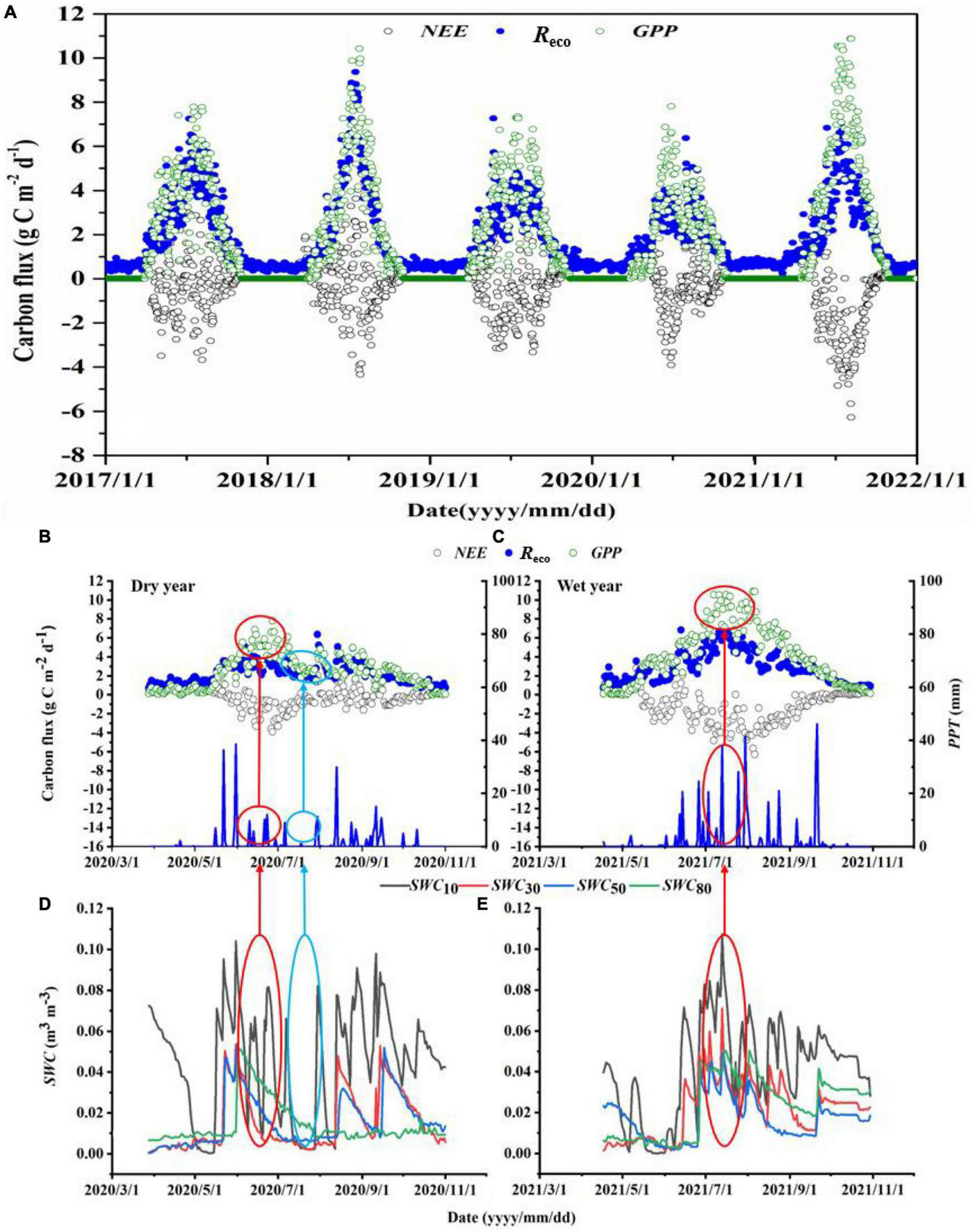 (A) Seasonal variability of the daily mean carbon fluxes (NEE, net ecosystem exchange; Reco, ecosystem respiration; GPP, gross primary productivity) from 2017 to 2021. The variations of NEE, Reco, and GPP, and of precipitation (PPT) and soil water content at depths of 10, 30, 50, and 80 cm (SWC10, SWC30, SWC50, and SWC80, respectively) during the growing season in (B,D) the dry year (2020) and (C,E) wet year (2021). Red circles represent changes in NEE, Reco, and GPP and SWC in response to wet periods during the growing season; the blue circle represents the changes of NEE, Reco, GPP, and SWC during the dry period of the growing season.
