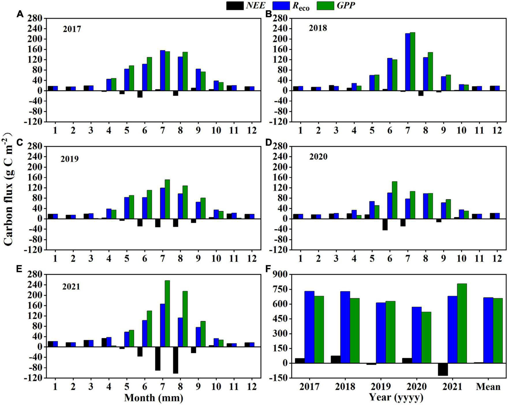 (A–E) Monthly and (F) inter-annual variations of the cumulative carbon fluxes (NEE, net ecosystem exchange; Reco, ecosystem respiration; and GPP, gross primary productivity) from 2017 to 2021.