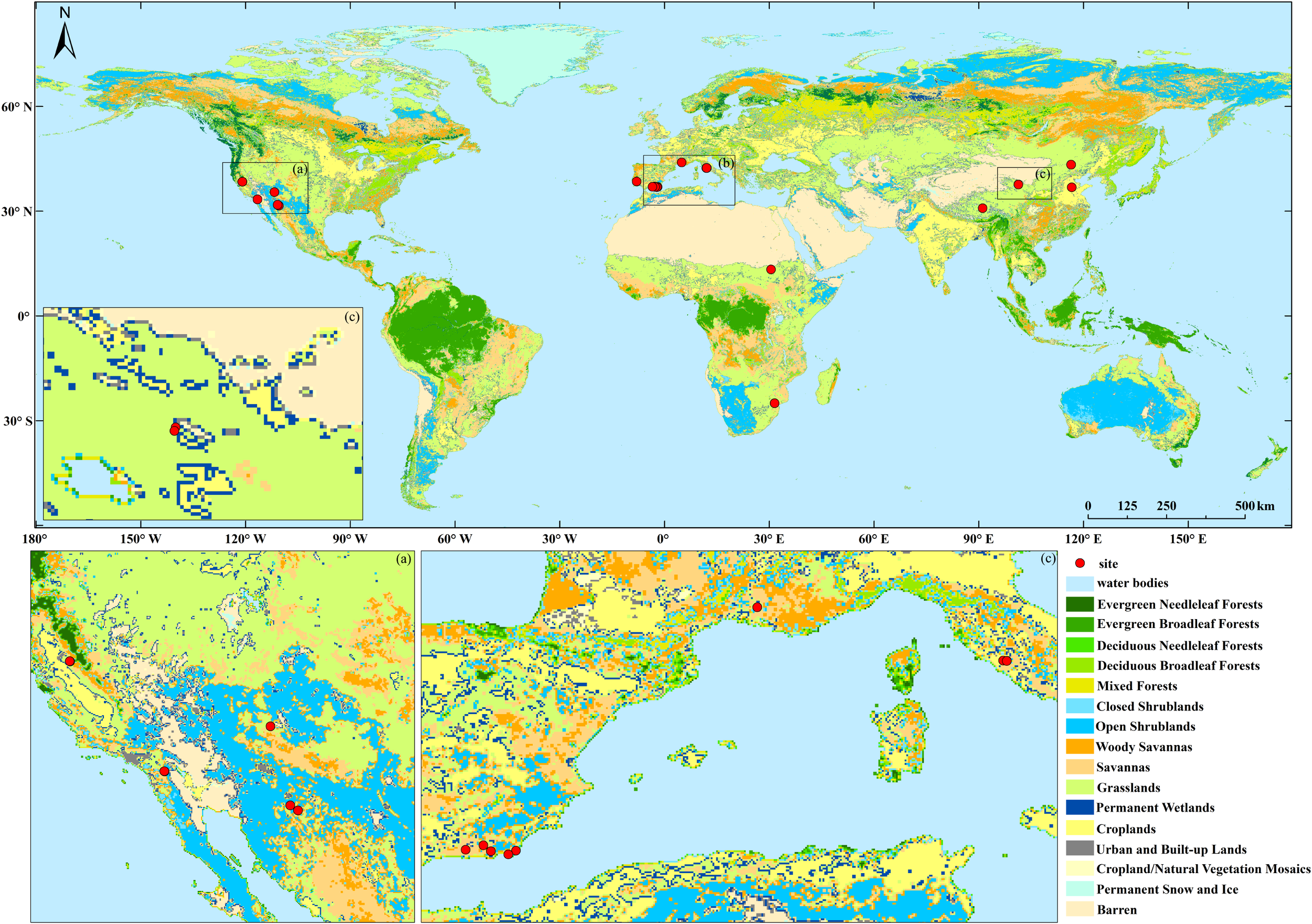 The spatial distribution of flux towers in this study.