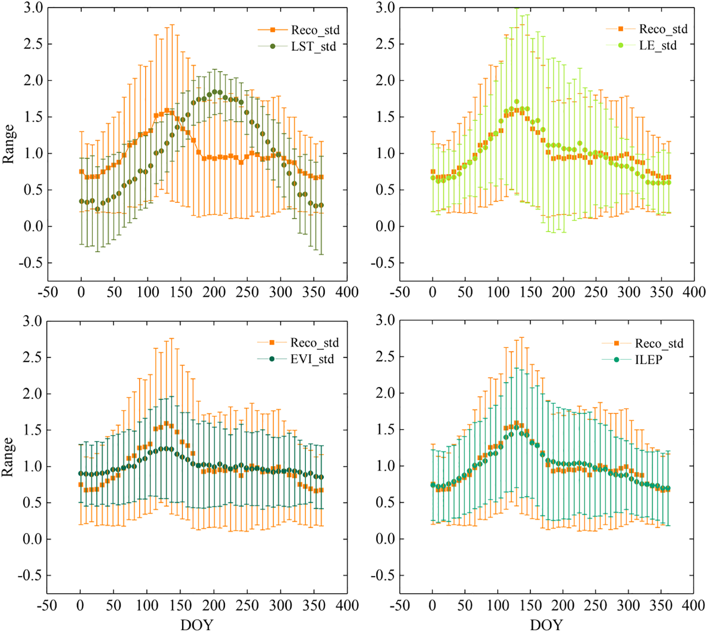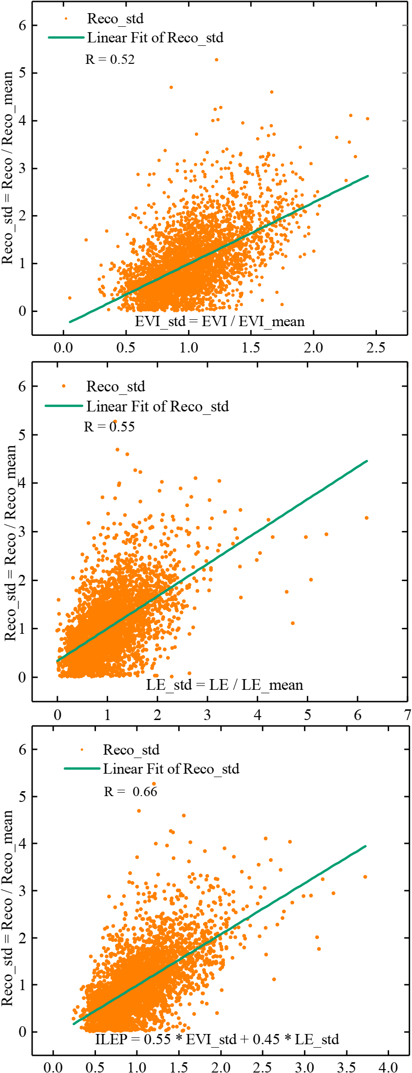 Correlation between Reco_std and EVI_std, between Reco_std and LE_std, and between Reco_std and ILEP (P< 0.01 in all the subplot).