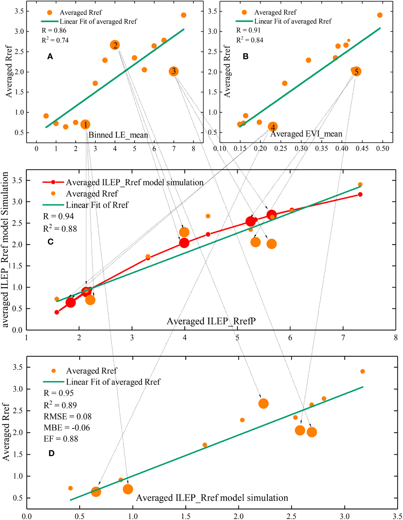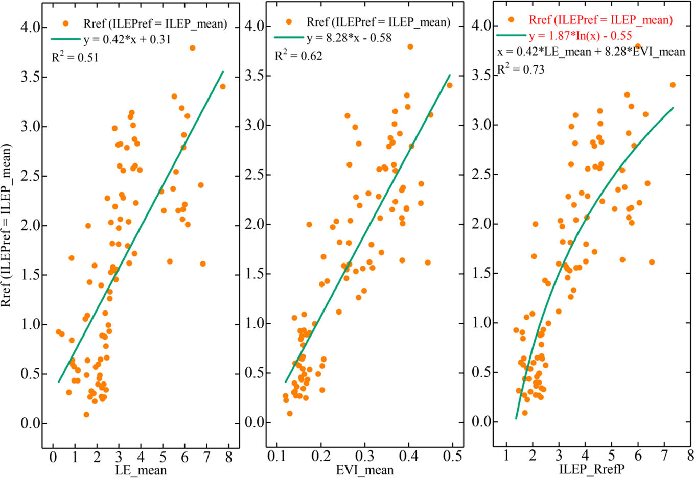 In the ILEP_Q10 model, the Q10 value is fixed using the mean value replacement method as done by Ai et al. (2018). Next, we found the correlation between EVI_mean values and the fitted Rref values, as well as the correlation between LE_mean values and the fitted Rref values, and we found that the fitted Rref values were positively, linearly correlated with EVI_mean values and LE_mean values. Based on this, another key indicator – ILEP_RrefP was developed: