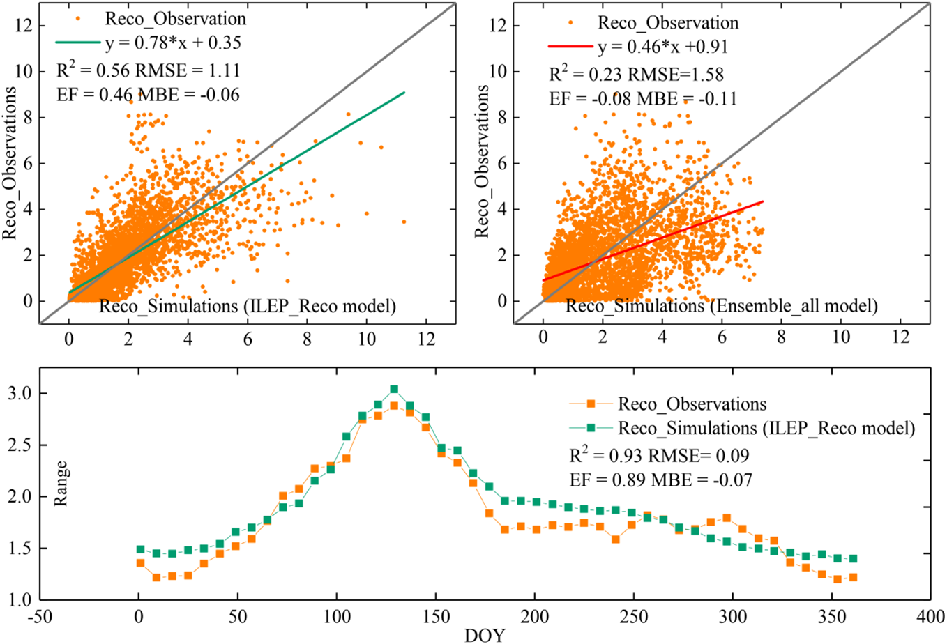 After all 6 parameters (P1, P2 in formula (7); P3, P4 in formula (9); P5, P6 in formula (10)) are fixed, the final remote sensing Reco model: ILEP_Reco model (formula (11)) was then developed by integrating the ILEP, Q10 model and the ILEP_Rref model: