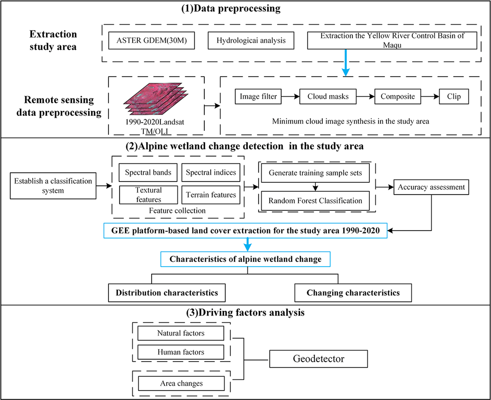 In this study, we acquire land cover findings for the study region from 1990 to 2020 based on the GEE platform, and then assess the extent, distribution, and variations of alpine wetland. Finally, we explored the driving factors for the area change of alpine wetlands (Figure 2).