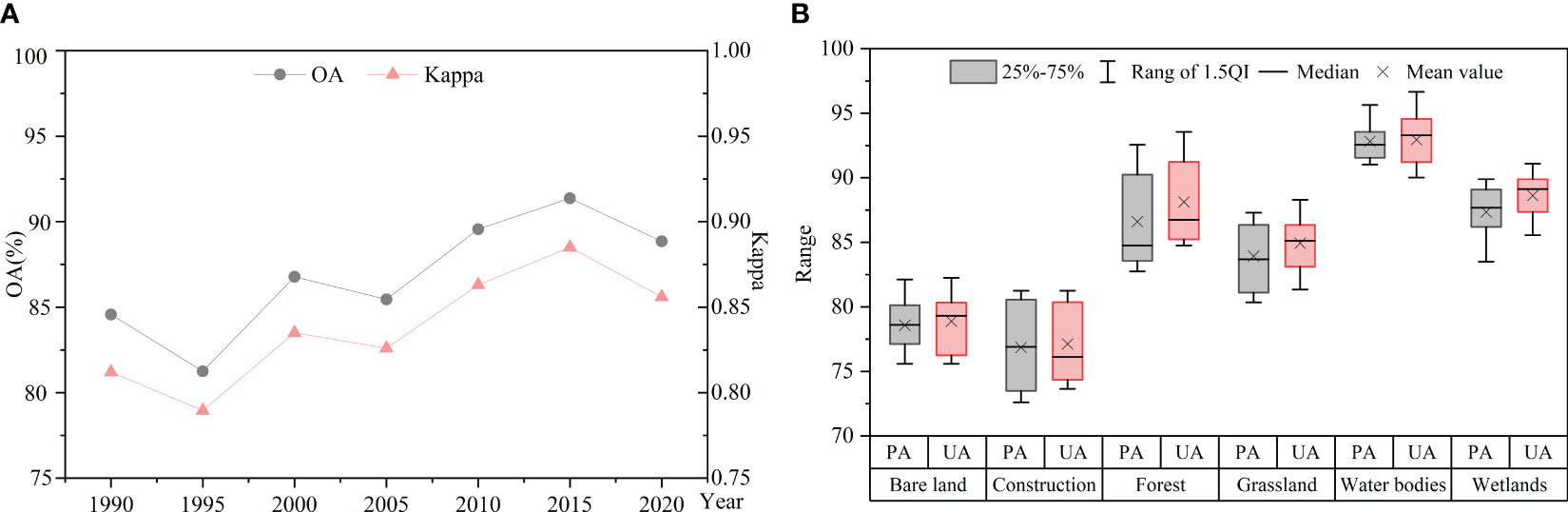 To evaluate the accuracy of the classification results, 80% of the sample data are chosen as training samples, while 20% of the samples are chosen as verification data. The confusion matrix of the classification results, kappa coefficient, overall accuracy (OA), producer accuracy (PA) and user accuracy (UA) were calculated to evaluate the accuracy of the classification results. The specific formula is as follows: