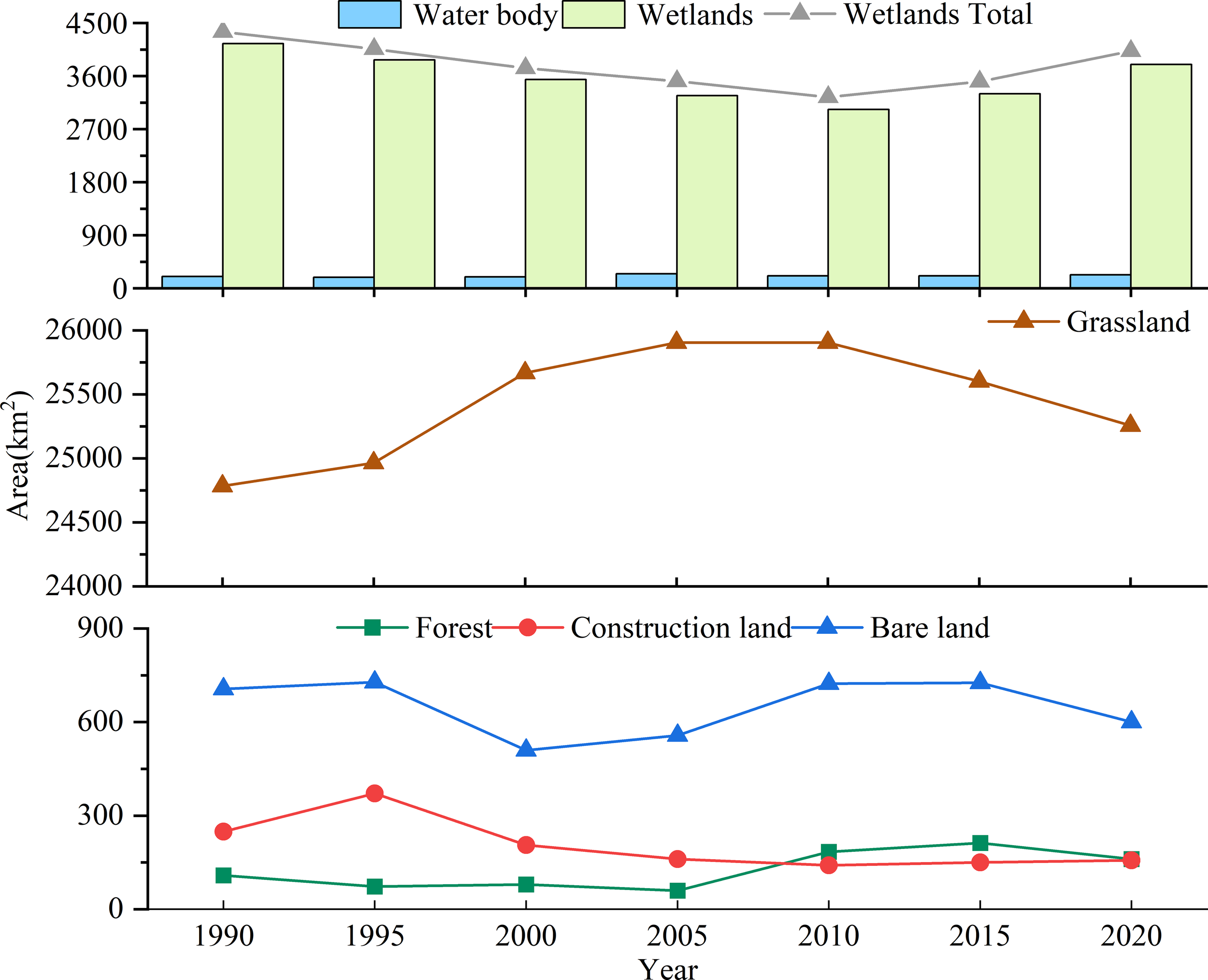 The land cover classification system for remote sensing in the study area was established with reference to the classification standards of wetlands in the international Convention on Wetlands and the domestic National Wetland Resources Survey and Monitoring Technical Regulations. The wetland types in the study area were mainly swamp wetland, wet meadow, and swamp meadow. In this study, the three wetland types were grouped together, and together with the total area of all water bodies were defined as the area of wetlands in the study area. The other landscape categories in the study area were forest, grassland, bare land, and construction land, and samples were selected and generated from the Landsat series of images using the GEE platform to create a training sample set.