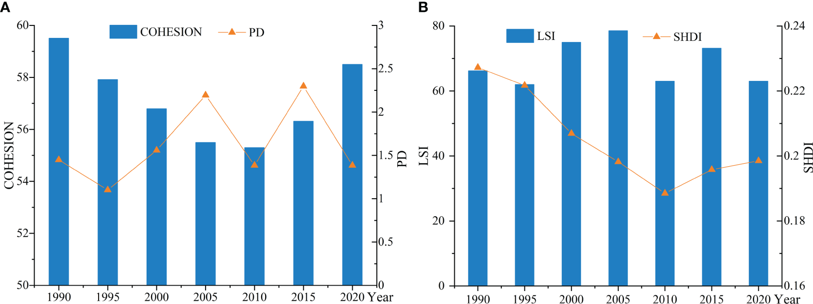In the related discipline of landscape ecology, the landscape index is a frequently employed quantitative research method for analyzing the evolution of landscape patterns (Liu et al., 2014; Mu et al., 2021; Yang et al., 2022). This study selects the Patch Cohesion Index (COHESION), Patch Density (PD), Landscape Shape Index (LSI) and Shannon’s Diversity Index (SHDI), with the conceptual and ecological significance of their related indices as shown in Table 3: