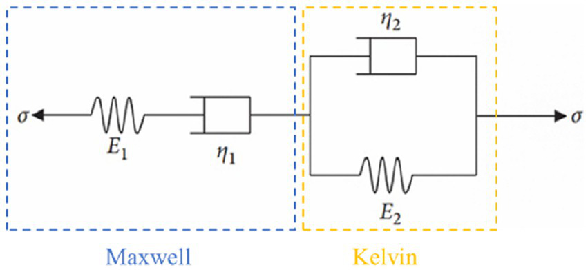 Concrete is a typical viscoelastic material. The Burgers creep model was chosen for the creep model to predict long-term concrete deformation. Notably, the Burgers body consists of a Maxwell body and a Kelvin element in series (Ma et al., 2022; Figure 4).