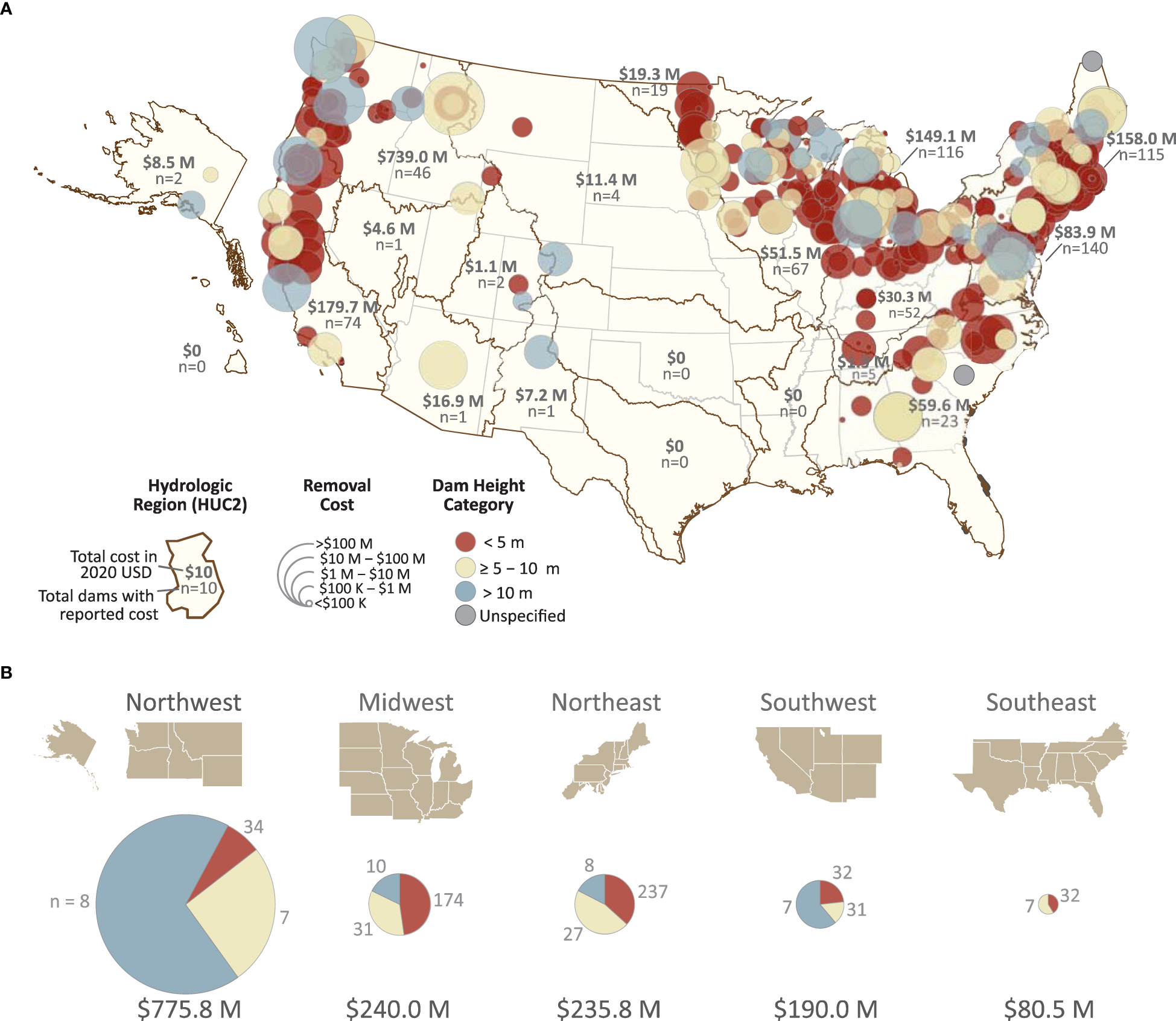 (A) Map visualization aggregating cost estimates of dam removals in the United States from 1965 to 2020. Dams depicted by height category (fill color) and cost bubbles (diameter) ranging across 5 orders of magnitude. Total number removed and total cost (calculated based on 2020 dollars using RS Means construction cost index) were aggregated to Hydrologic Unit 2 watersheds. (B) Regional cost estimates of dam removal by dam height category. Size of pie charts proportional to total cost for each region.