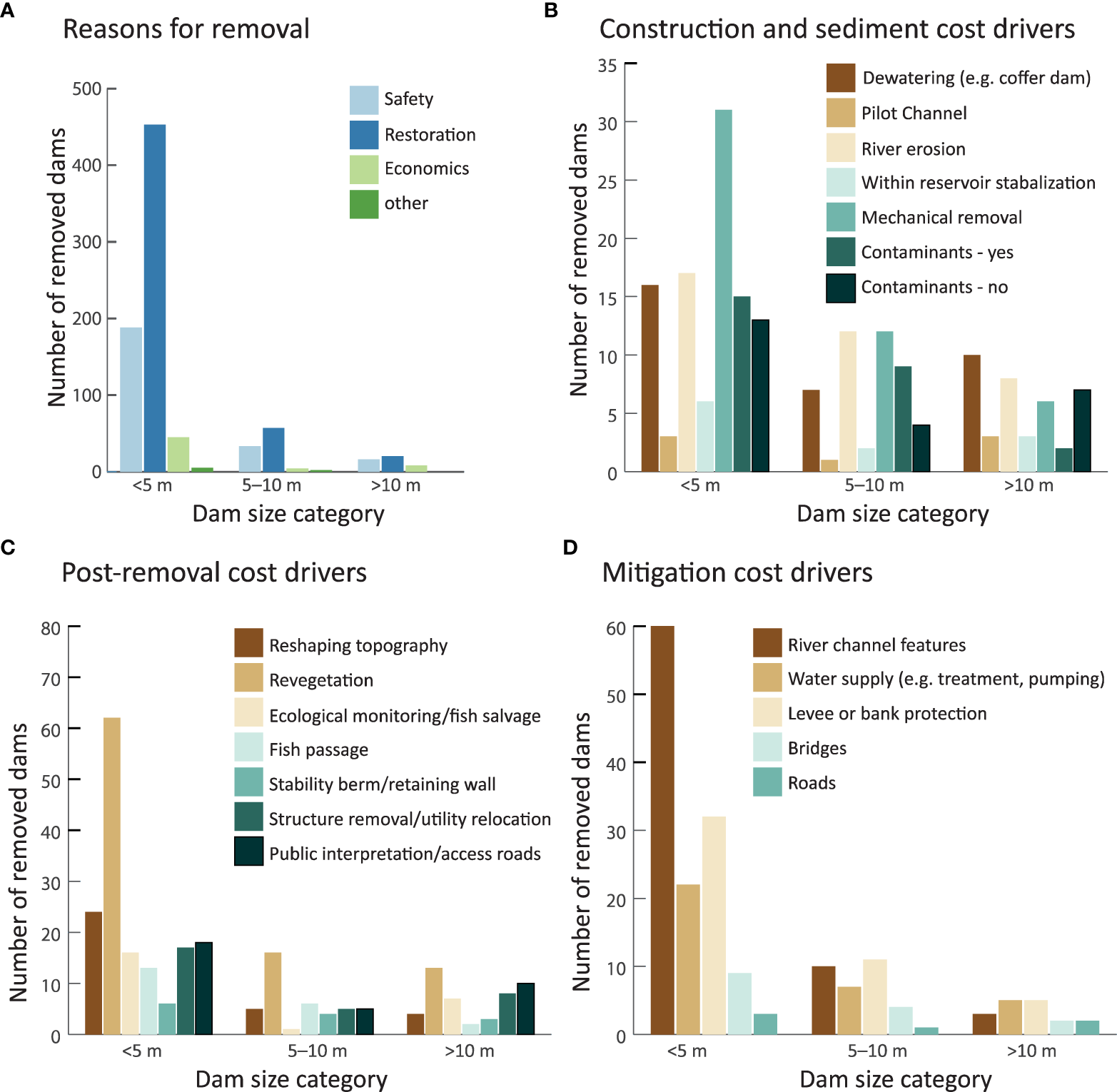 Apart from the reported cost, we reviewed available source material and data sources to collate information on the characteristics and cost drivers of each dam removal project. We searched for any mention of why the dam was being removed, which typically fell into the categories of safety, river or ecosystem restoration, economics (e.g., it was more cost effective to remove the dam than conduct repairs, continue maintenance, or provide upgrades), or “other”. Next, we identified the presence of any cost drivers noted in the documentation of the dam removal. A total of 28 different cost drivers were identified and categorized into activities related to construction and sediment management, mitigation, and post-removal outcomes. Construction and sediment cost drivers (n = 6) related to whether: coffer dams or other site dewatering activities were needed; reservoir sediments were contaminated or not; river erosion or mechanical removal was used for sediment mobilization; sediment stabilization was required; and the use of a pilot channel through delta deposits was used. Mitigation cost drivers (n = 11) were related to activities needed to minimize the effects of dam removal, including: construction or enhancement of river habitat features; replacing or protecting water supply infrastructure; protecting levees or riverbanks; mitigating flood risk via property purchases; protecting or constructing bridges; protecting or constructing a fish hatchery; or protecting roads or wells. The post-removal cost driver category (n = 11) included: reshaping reservoir or downstream topography; revegetation; control of invasive species; fish passage; monitoring; installation of stability berms or retaining walls; burial or removal of structures for safety; relocation or protection of utilities; creation of access roads; and installation of interpretive displays.