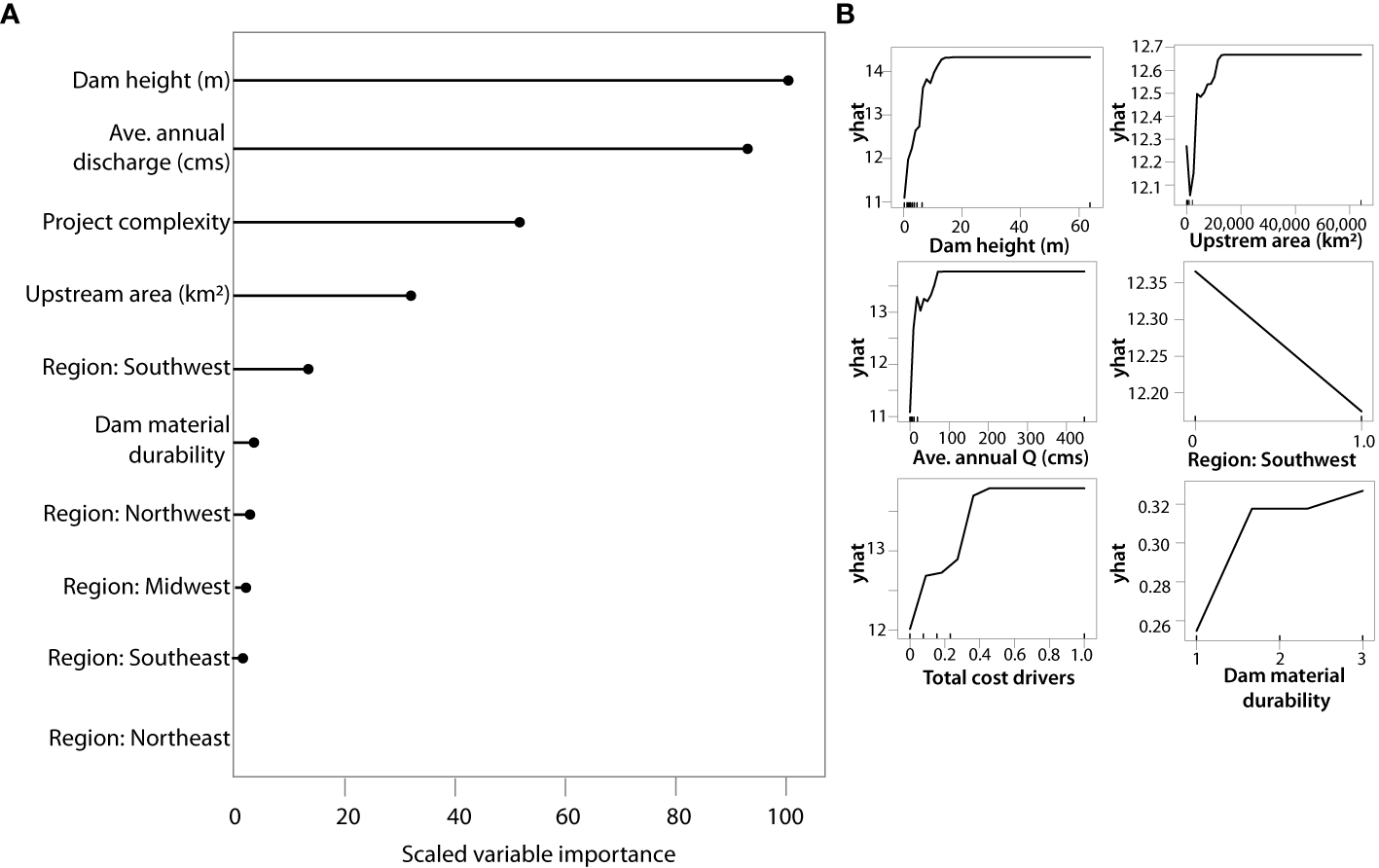 We modelled natural log-transformed cost data against six predictor variables shown in exploratory analyses to influence cost – dam height (m), average annual discharge (m3/s), drainage area (km2), project complexity, dam material, and region (one hot-encoded as five variables). We analyzed the relationships between dam removal costs and various predictor variables using stochastic gradient boosting (SGB; Friedman, 2002) with quantile regression, together called gradient boosted quantile regressions (GBQR). SGBs are a machine learning technique in which an ensemble of shallow and weak trees is successively built such that the performance of each tree is boosted by improving on the errors (residuals) of the preceding tree (Friedman, 2002). Unlike conventional regression trees that fit a single parsimonious model, SGBs incorporate the advantages of regression trees (i.e., handling mixed data types and missing data) while overcoming some of their limitations like poor predictive performance, lack of optimal tree structure, and high sensitivity to small changes in the data set (Elith et al., 2008). At each iteration, a tree is built from a random sub-sample of the dataset which incrementally improves model prediction accuracy while preventing over-fitting of the data. An advantage of the method is that predictor variables do not need to be transformed prior to analysis, since SGBs can fit non-linear relationships. Additionally, interactions between predictors do not need to be specified a priori (Elith et al., 2008).