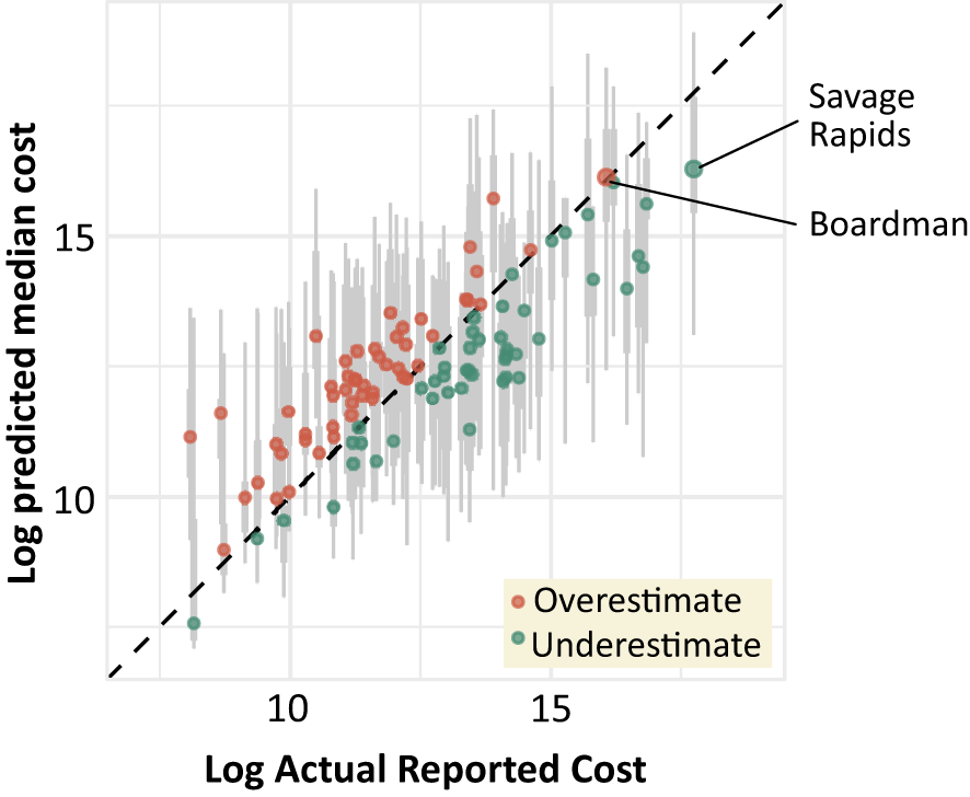 Reliable estimates of dam removal project costs are important because unrealistic estimates can lead to elimination of dam removal as a feasible alternative, distrust among the public and affected parties, and delayed or derailed projects. Furthermore, dam removal cost estimates can be useful as decision criteria in strategic dam removal planning, particularly when a portfolio of dams are being evaluated. Although several decision-support tools for barrier removal planning exist (Branco et al., 2014; Hoenke et al., 2014; McKay et al., 2017; Guetz et al., 2022), the predicted costs of dam removals are rarely factored into prioritization exercises (Doyle et al., 2003). The incorporation of cost can enhance strategic barrier management planning which in turn can deliver and align economic and socio-ecological benefits (Zheng and Hobbs, 2013; Roy et al., 2018).