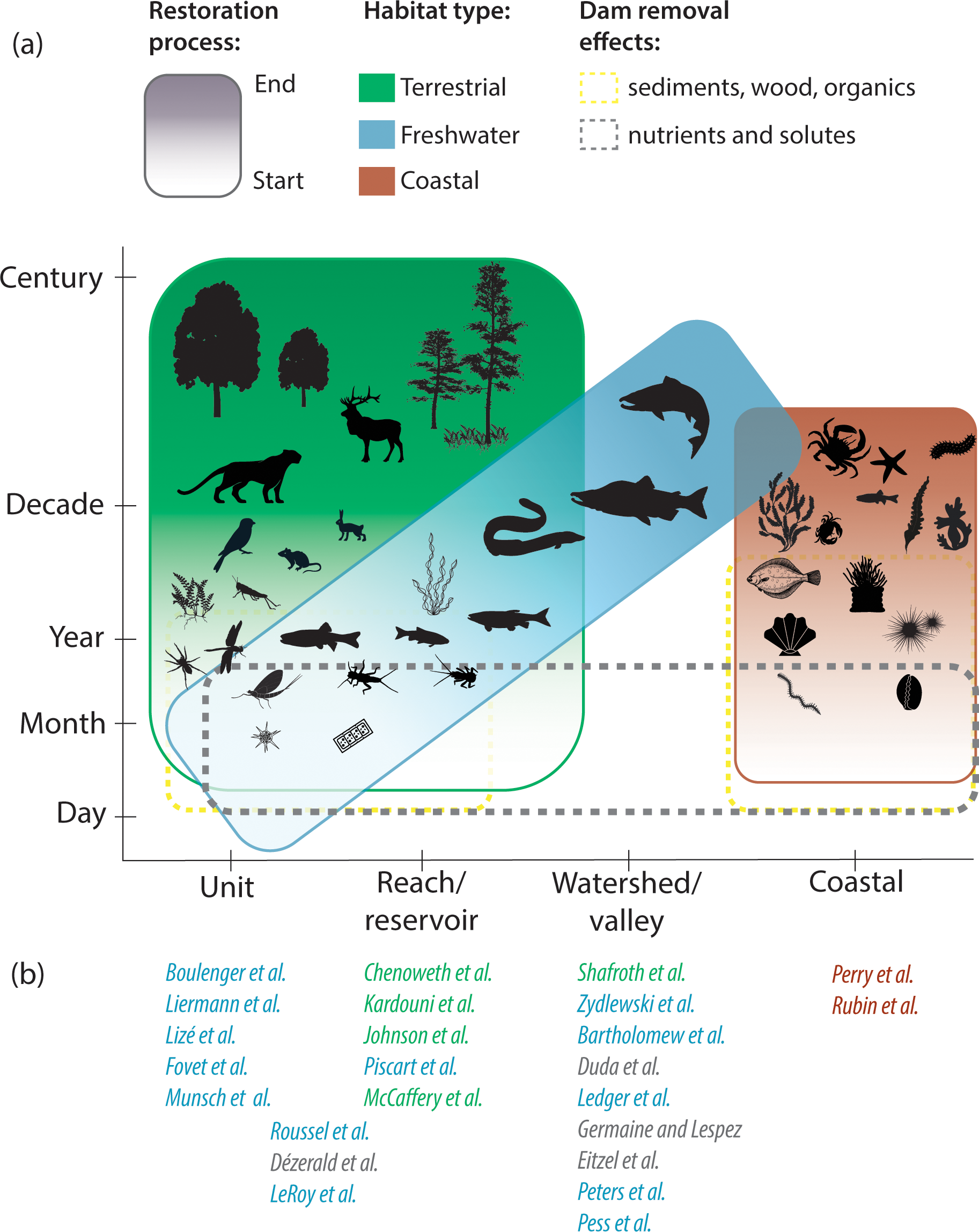 Rivers underpin vital ecosystems that support aquatic and terrestrial biodiversity and many ecosystem services, including food, water, culture, and recreation (Dudgeon et al. 2006). After centuries of building dams on rivers across the world, river restoration via dam removal is receiving increased public attention, financial investment, and scientific study because of various issues of regarding dam infrastructure, such as obsolescence, sedimentation, and ecosystem degradation (Duda and Bellmore, 2022; East and Grant, 2023). Most dam removal projects to date have focused on smaller structures, but larger structures > 10 m tall have also started to be removed in increasing numbers. Recent estimates suggest that only a small fraction of all dam removals have been scientifically studied, with most focused on small dams and short time scales (Bellmore et al., 2016). Understanding the outcomes of large dam removal, where case studies are much more limited, depends on sustained research and monitoring efforts aimed at understanding restoration processes over large spatial and temporal scales (Figure 1). The ecological and socio-ecological study of large dam removal represents a new frontier in dam removal research: projects are larger, more recent, and provide an opportunity to understand the complex ecological changes and impacts to humans that occur with these transformative restoration projects.