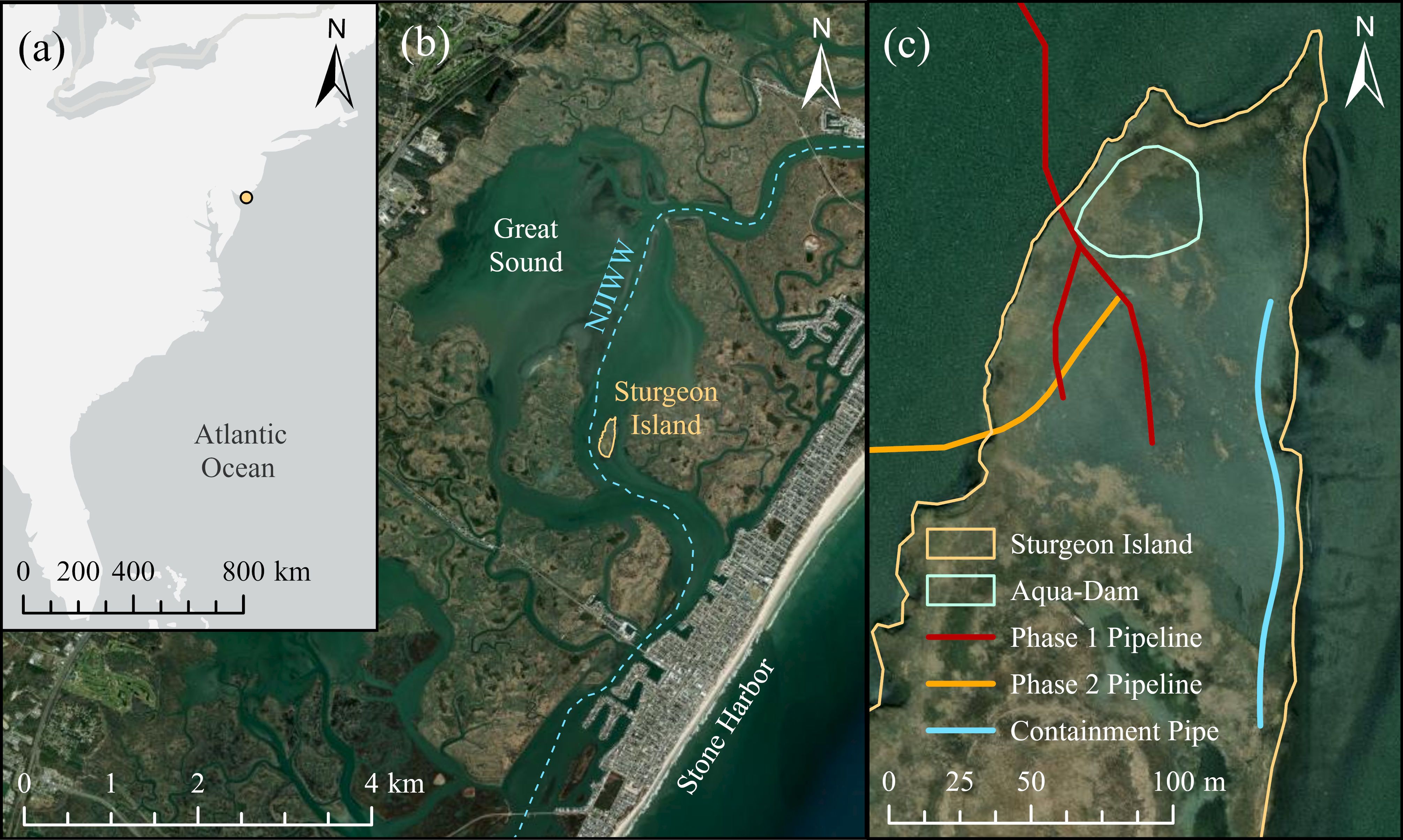 Figure 1. (A) Location of Sturgeon Island, New Jersey, USA, (B) in relation to the New Jersey Intracoastal Waterway (NJIWW), and (C) dredge pipeline and containment layout.