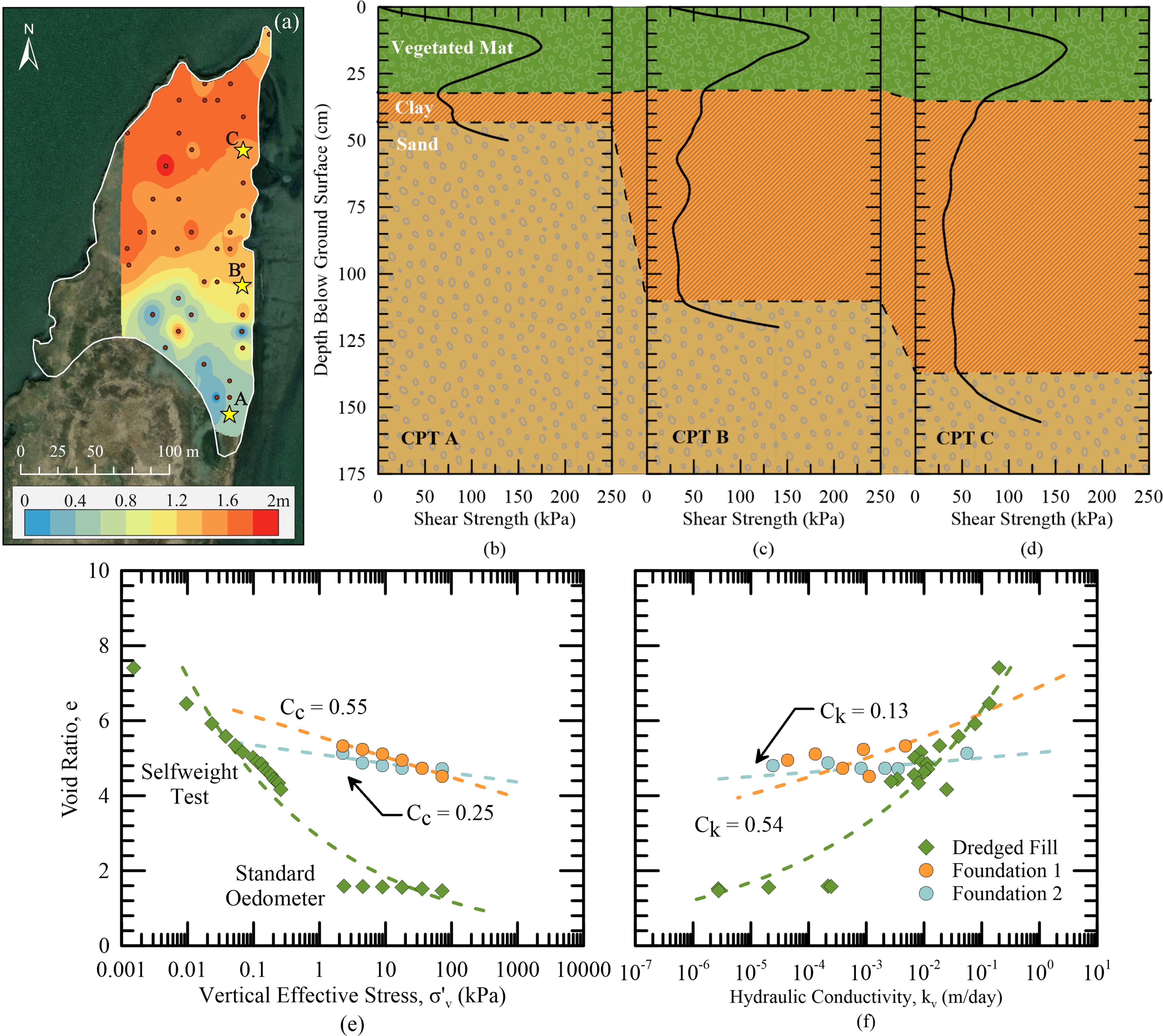 Figure 2. Site Geotechnics. (A) Location of CPTs (black dots) and interpolated depth to underlying sand foundation across the placement site. (B–D) Example shear strength profiles and interpreted stratigraphy moving northward from the center of the island. Profile letters correspond to stars on the map. (E) Void ratio-vertical effective stress and (F) void ratio-hydraulic conductivity relationships for dredged fill and foundation materials. Point data was derived from laboratory testing and dashed lines represent interpolated laboratory data.